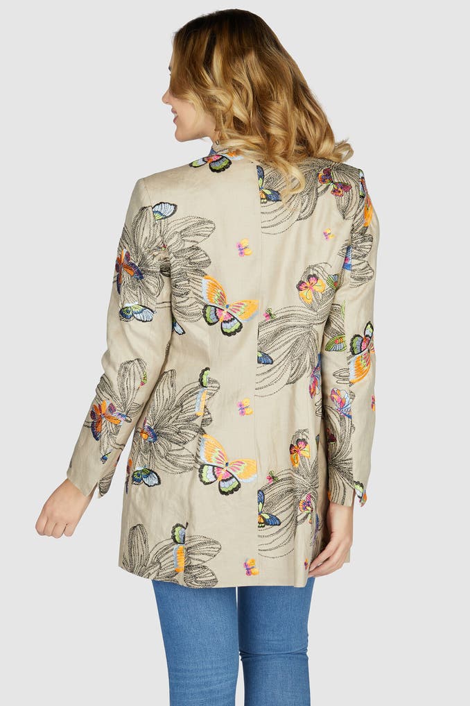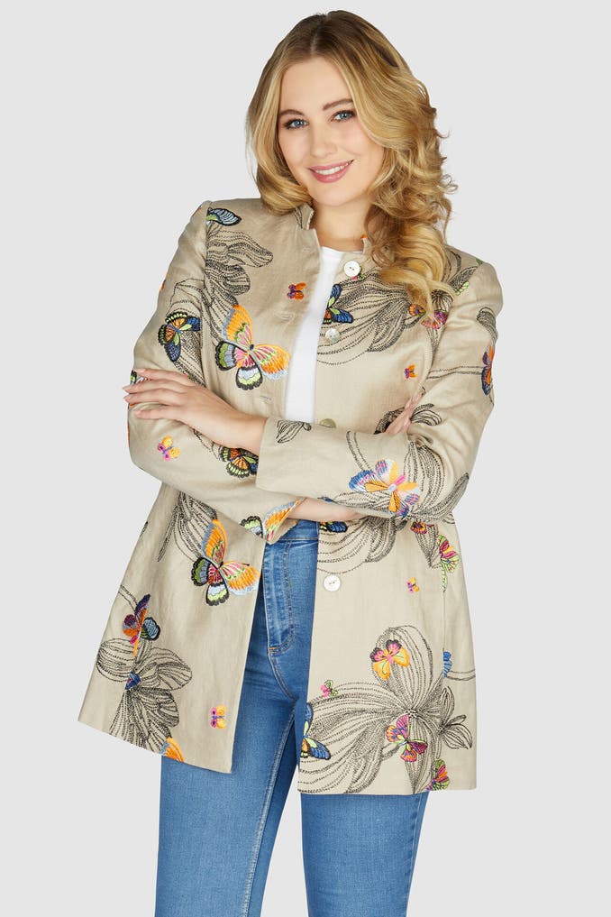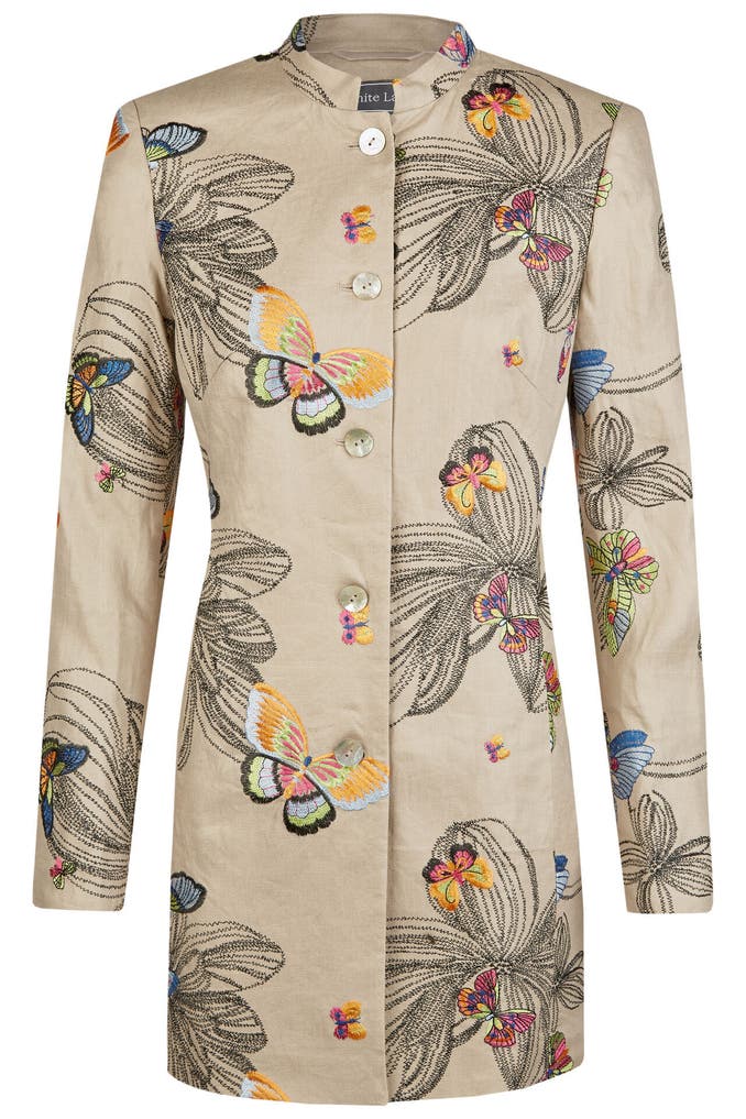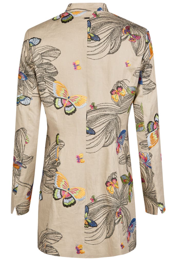 Gehrock aus allover besticktem Leinen mit Stehkragen, Nahttaschen und Ärmelschlitz, gefüttert.