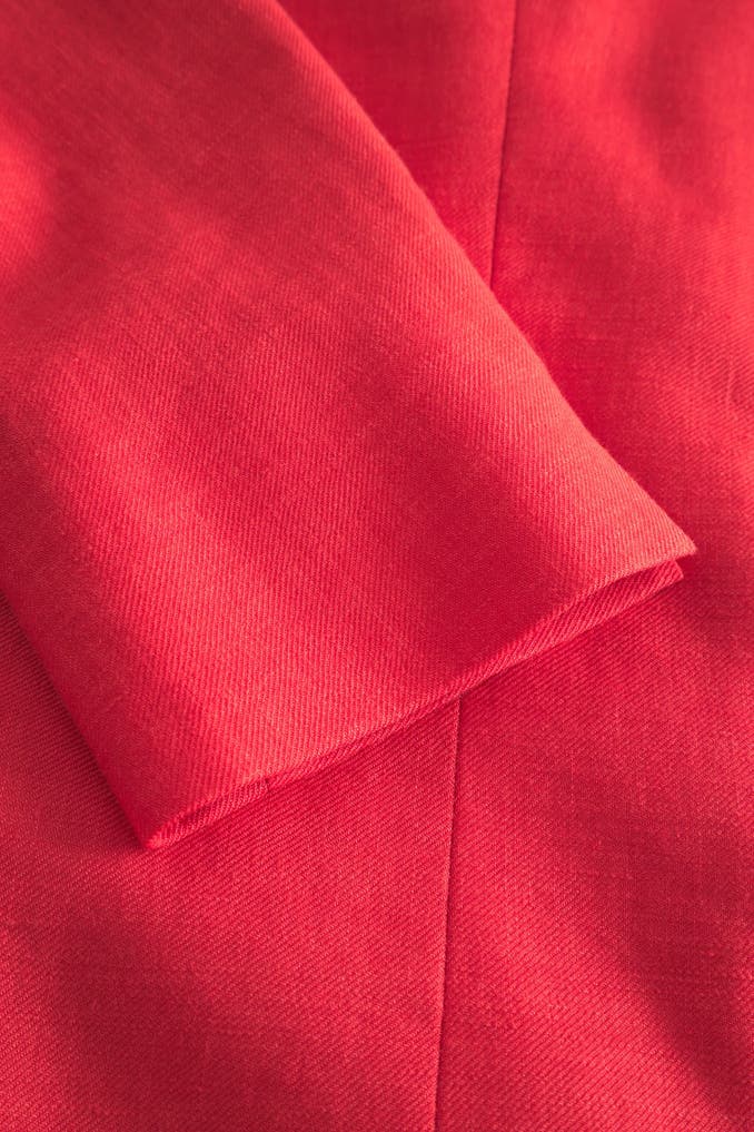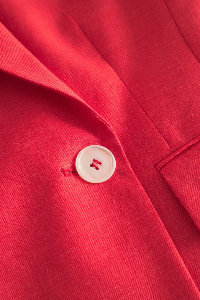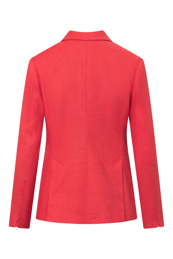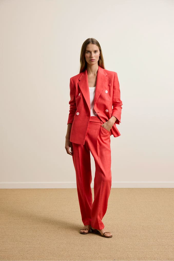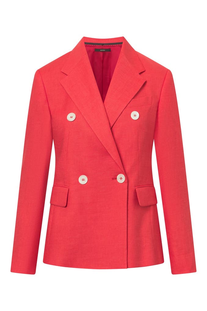 Im Doppelreiher-Design mit kontrastiven Knöpfen, einem klassischen Reverskragen und formgebender Schulterverarbeitung erweist sich der schmal geschnittene Blazer als favorisiertes Essential zu jedem Anlass. Pattentaschen und doppelte Bewegungsschlitze ergänzen das Design – aus Leinenstretch.