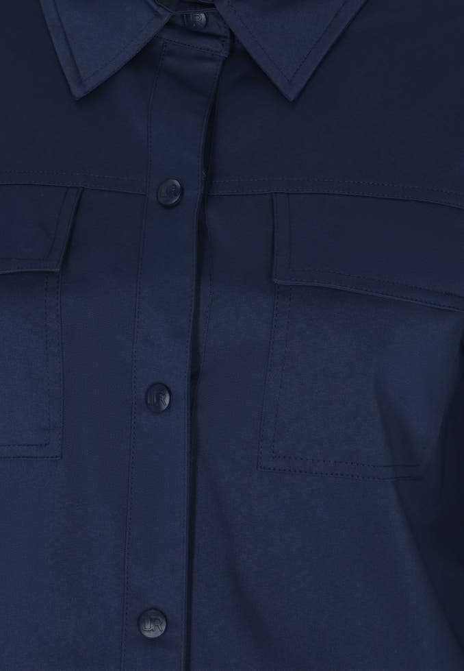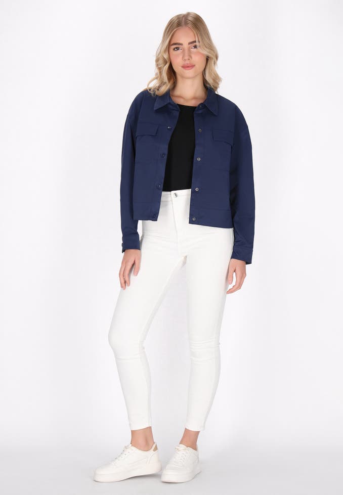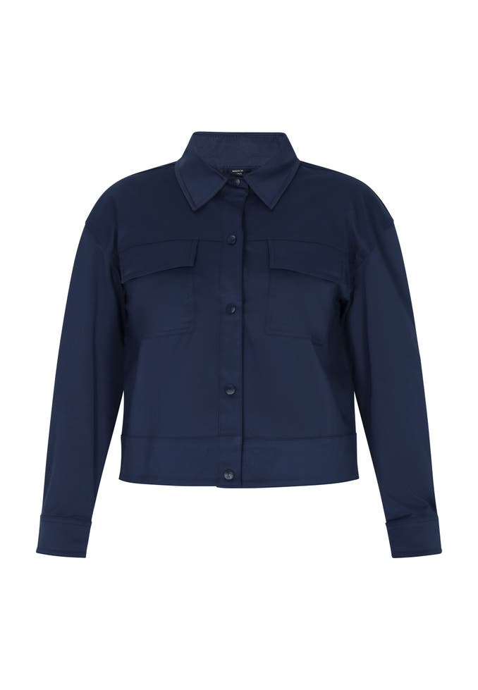Entdecken Sie eine Jacke mit einer strukturierten Silhouette, die einen klassischen Kragen und eine vordere Knopfleiste aufweist. Funktionale Brusttaschen mit Klappenverschlüssen verbessern das Design. Lange Ärmel mit geknöpften Manschetten bieten Verstellbarkeit. Der verkürzte Saum und die taillierte Passform sorgen für ein elegantes Aussehen, das durch Nähte für zusätzliche Struktur und Form betont wird.
