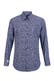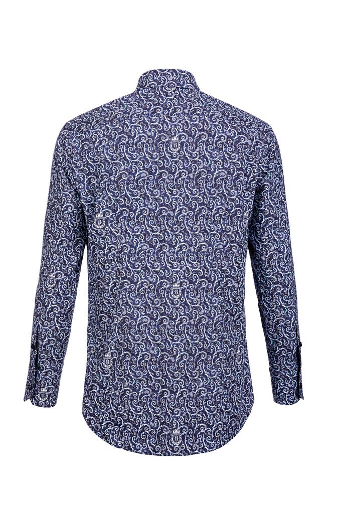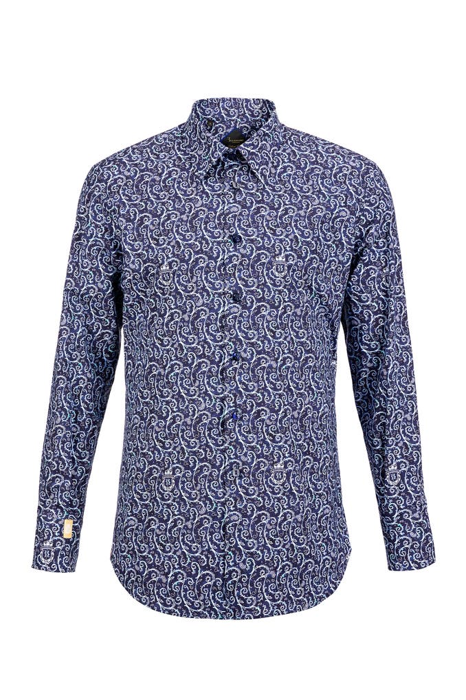 Rundum bedrucktes Baumwollhemd. Extremer Haifischkragen mit herausnehmbaren Kragenstäbchen. Quadratische Knöpfe. Mit Abnähern am Rücken. Silver Cut.
