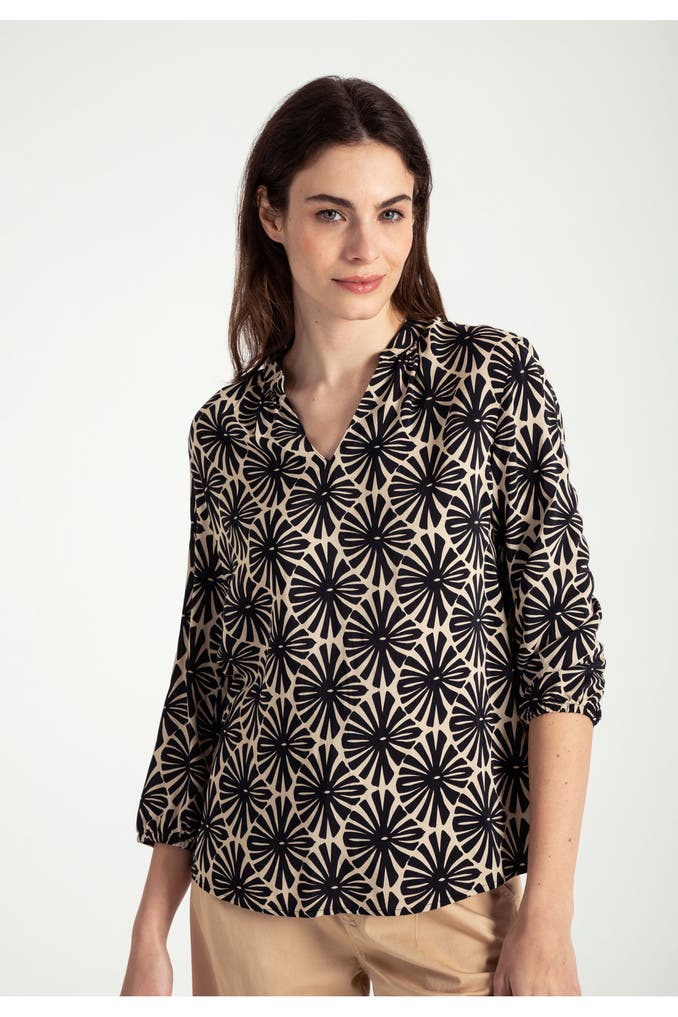 Die fließende Viskosebluse von MORE & MORE mit grafischem Allover-Print in schwarz/sand lässt sich easy stylen. Sie passt sowohl zur klassischen Businesshose, als auch zur sportiven Chino oder lässigen Jeans.