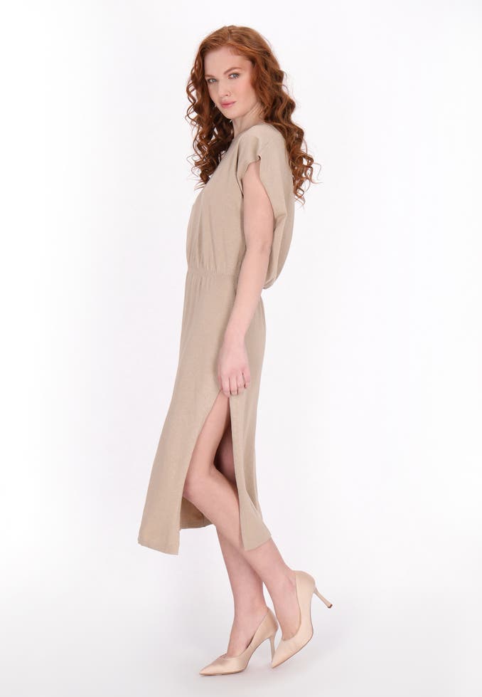 Discover a dress with a loose fit and elegant design. With cap sleeves and a round neckline, this midi dress is perfect for a variety of occasions. The elastic drawstring waist contours the silhouette, while the soft, textured material ensures comfortable wear. A timeless dress from the Classic Look Collection that offers both style and casualness in everyday fashion.