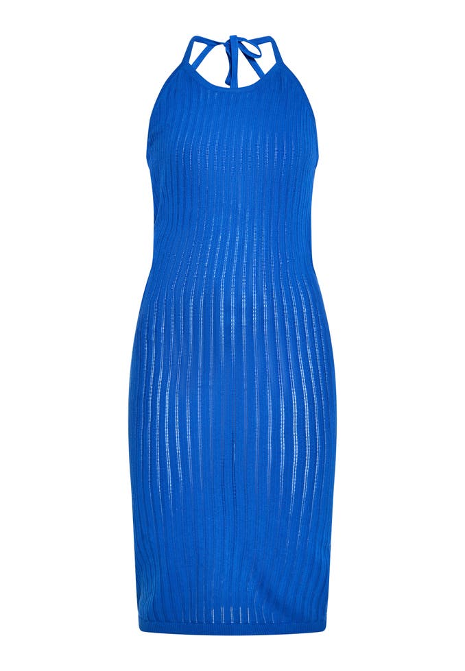 Wir stellen Ihnen ein elegantes und raffiniertes Midikleid mit taillierter Silhouette vor, perfekt für alle, die moderne Eleganz schätzen. Dieses ärmellose Design verfügt über einen hohen Ausschnitt und einen schmeichelhaften Neckholder-Stil auf der Rückseite. Die gerippte Textur und die vertikalen Linien, die über das Kleid verlaufen, sorgen für einen optisch auffälligen Look, während die figurbetonte Passform Ihre Kurven wunderbar betont. Das Kleid schmiegt sich durch den offenen Rücken und das Bindeband am Rücken perfekt an die Figur an. Dieses in Zusammenarbeit mit ebeeza entworfene Stück verbindet zeitlosen Stil mit modernem Design.