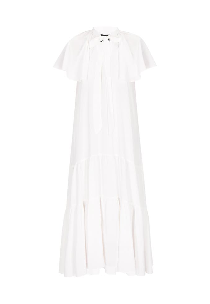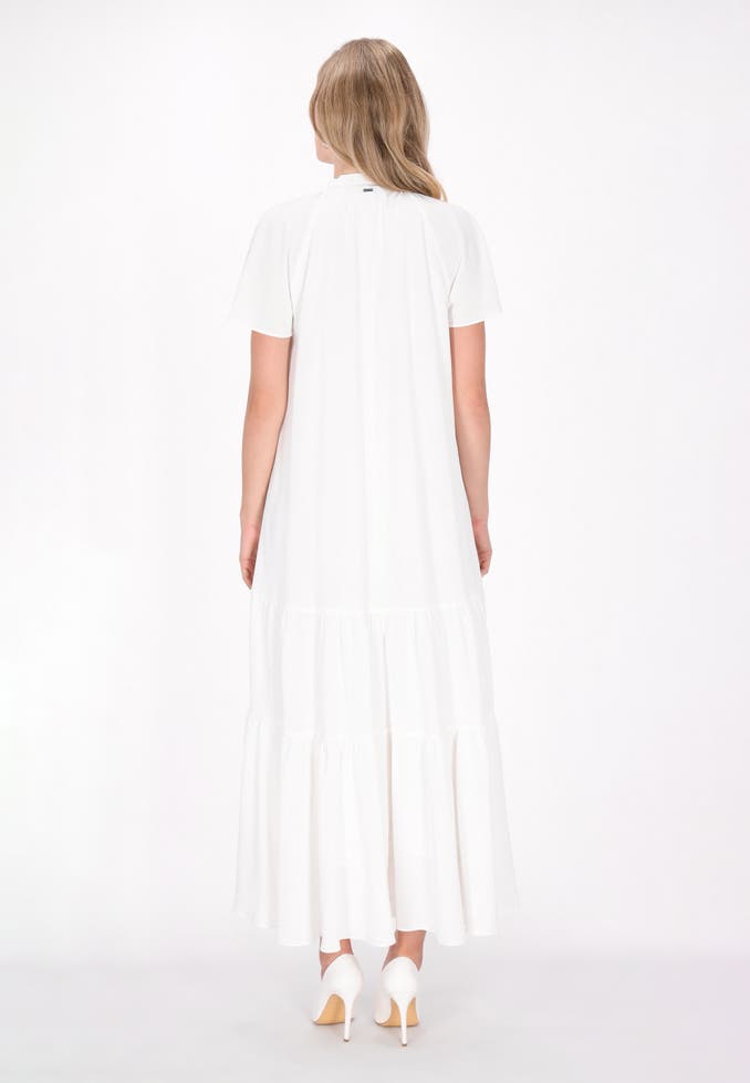 Embrace effortless elegance with this stylish midi dress featuring a relaxed fit. The keyhole neck and tie detail add charm, while short sleeves with ruffled accents enhance sophistication. Its tiered design flows gracefully from the waist to a ruffled bottom, making it a timeless dress in your Classic Look Collection that exudes refined style.