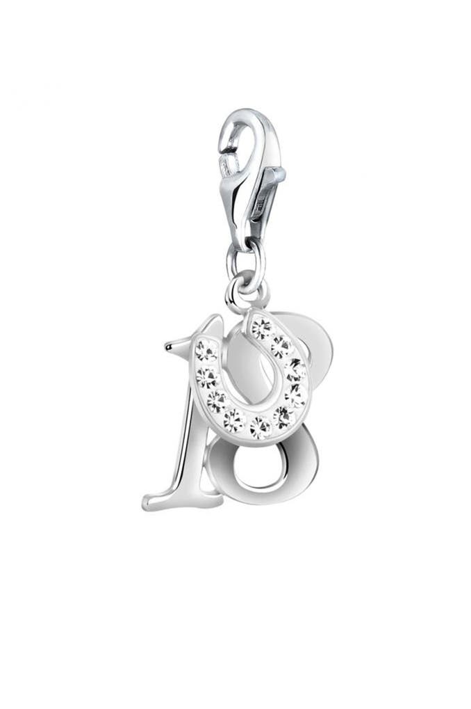 Wunderschöner Charm-Anhänger Zahl 18 aus feinstem 925er Sterling Silber und einem zierlichen Glücks-Hufeisen mit Swarovski® Kristallen. Das Hufeisen als Glücksbringer kombiniert mit der Zahl 18 ist eine hübsche Idee zur Volljährigkeit. Dieser hinreisende Charm passt durch seinen Karabinerverschluss für alle gängigen Charm Systeme und Charm Träger oder Bettelarmbänder.