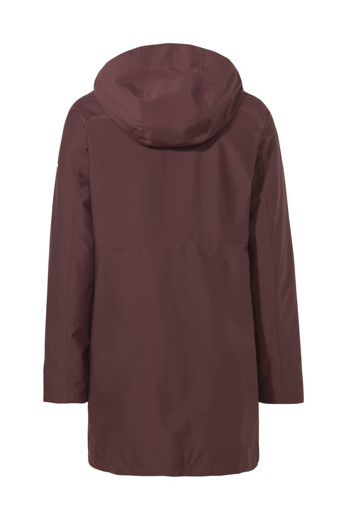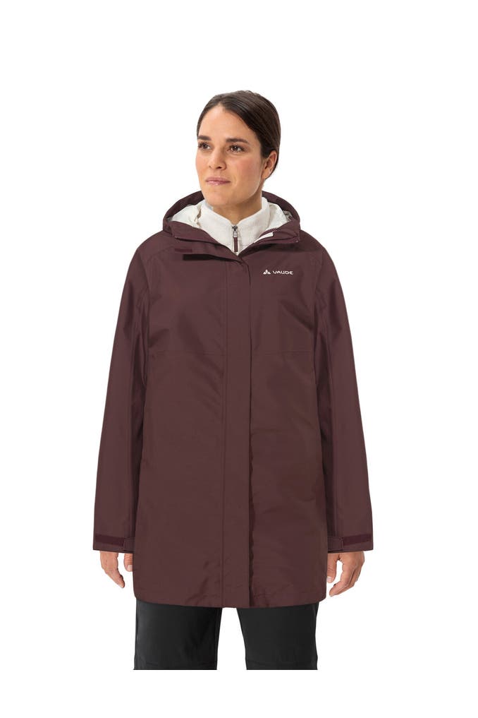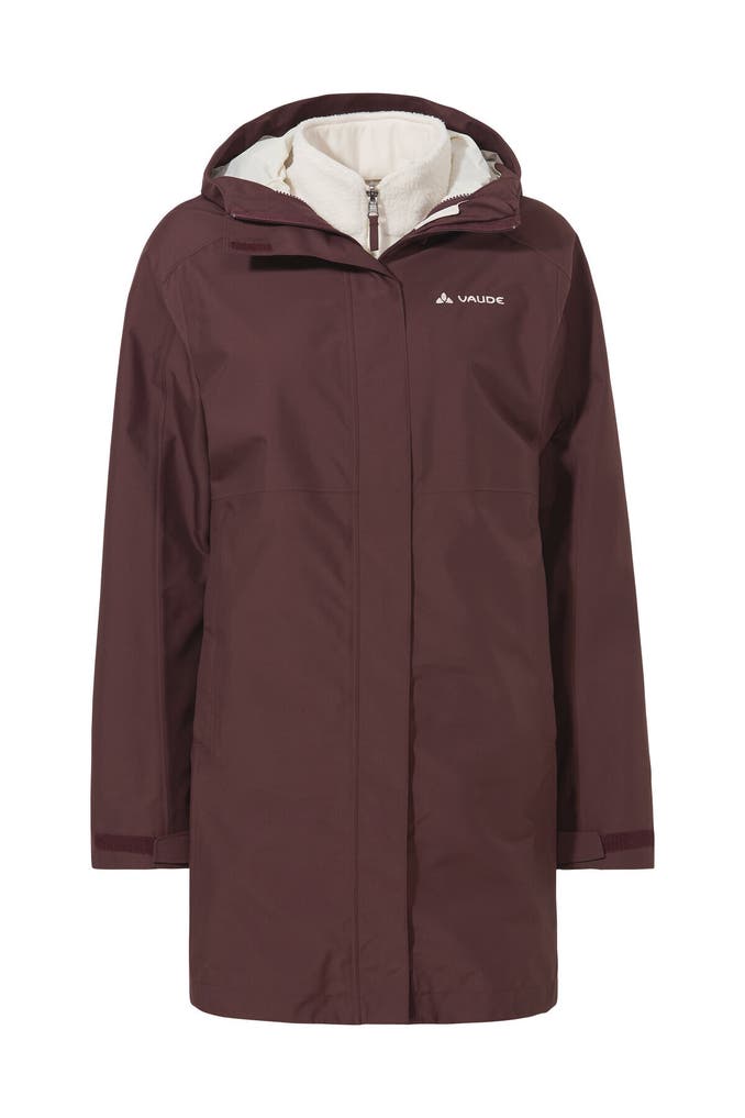 Dieser 3in1 Parka für Damen bietet drei Möglichkeiten. Man kann nur die äußere wasserdichte Jacke tragen und hat eine angeschnittene Kapuze mit Verstellung, die sich im Kragen verstauen lässt, und einen 2-Wege-Reißverschluss vorne. In der äußeren Schicht befinden sich auch die drei Taschen: zwei Reißverschlusstaschen vorne und eine Napoleontasche. Wenn es weder regnet noch windet, kann man aber auch nur die Innenjacke aus Fleece in Parkalänge tragen - oder im Zweifel eben beides. Der Saum und die Ärmelabschlüsse lassen sich bei dem Damen 3in1 Parka in der Weite verstellen, sodass Wind und Regen draußen gehalten werden. Zusätzlich zur wasserdichten Membran ist der Oberstoff mit Eco Finish wasser- und schmutzabweisend ausgerüstet. VAUDE verzichtet dabei auf Fluorcarbone, sogenannte PFAS- beziehungsweise PFC-Chemikalien, die im Verdacht stehen, gesundheitsschädlich zu sein. Das VAUDE Green Shape-Label steht für ein umweltfreundliches, funktionelles Produkt aus nachhaltigen Materialien.