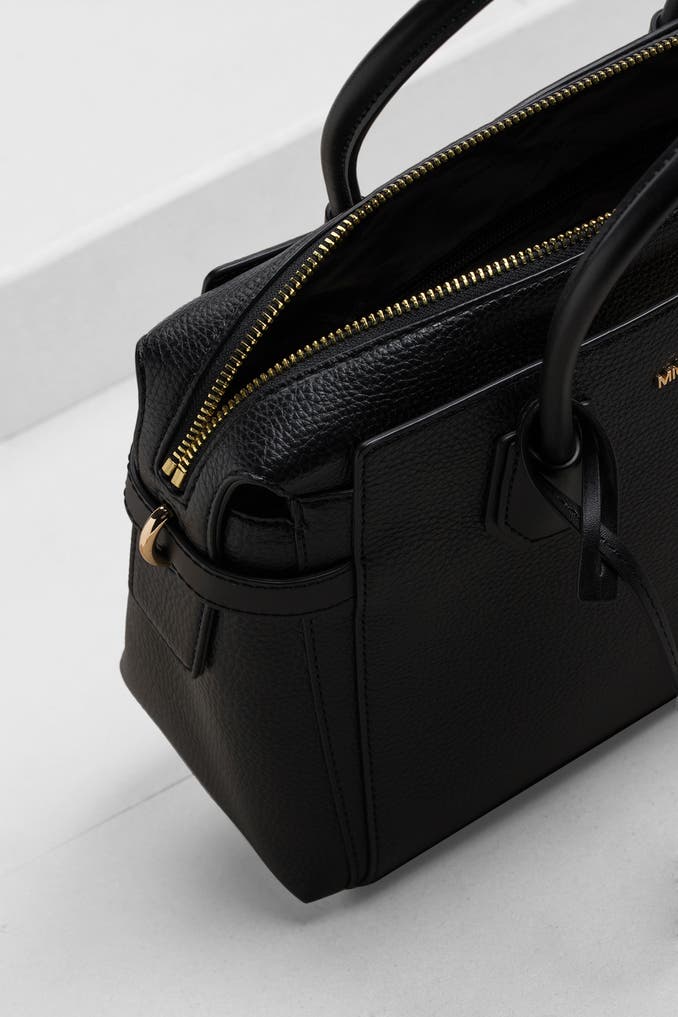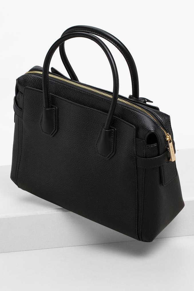 - zwei Tragehenkel und ein längenverstellbarer Schulterriemen mit goldfarbener Dornschließe