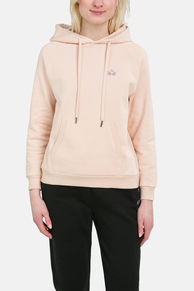 Verwöhnen Sie sich mit dem lachs-farbenen Hoodie von LA MARTINA! Dieses Modell besticht durch seinen geraden Schnitt und die Kapuze für extra Gemütlichkeit. Gönnen Sie sich dieses Design und setzen Sie ein modisches Statement in Ihrer Casual-Garderobe!