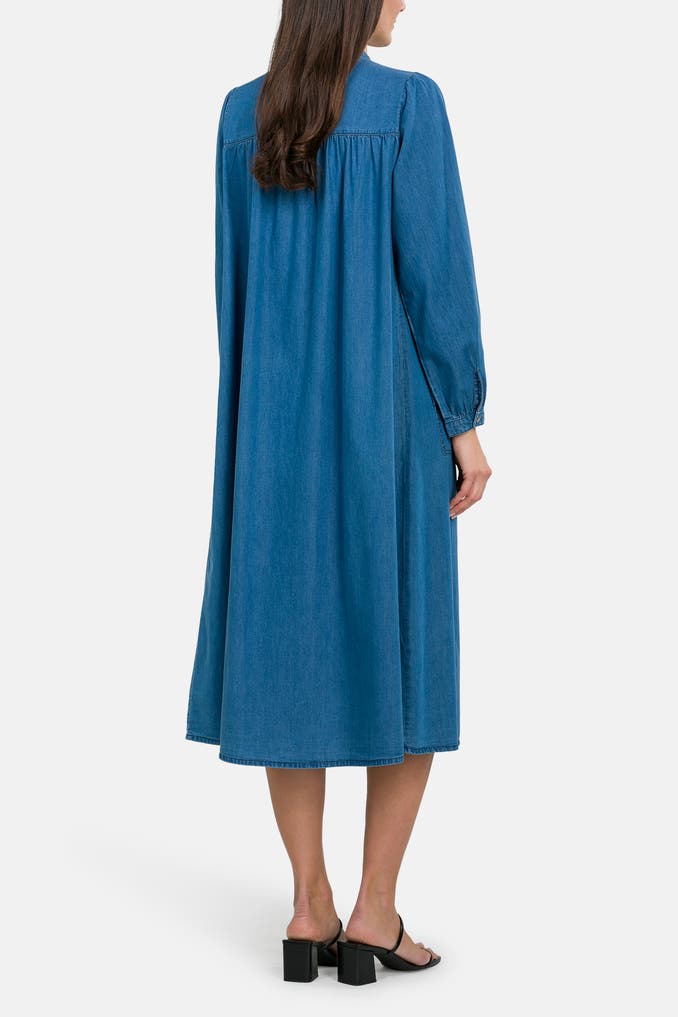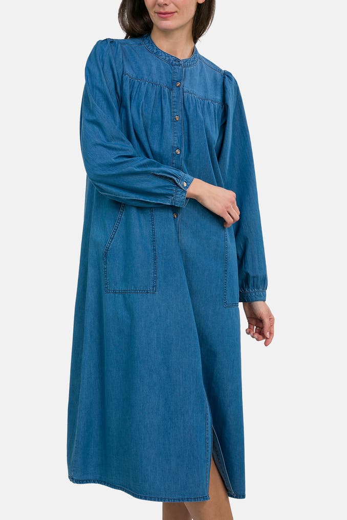 Verleihen Sie Ihrem Freizeit-Look mit dem blauen Kleid 'Jess' von Lolly Laundry eine stilvolle Note. Mit Stehkragen, geradem Schnitt und praktischen Details ist es ein trendiges und bequemes Must-Have für Ihre Garderobe!