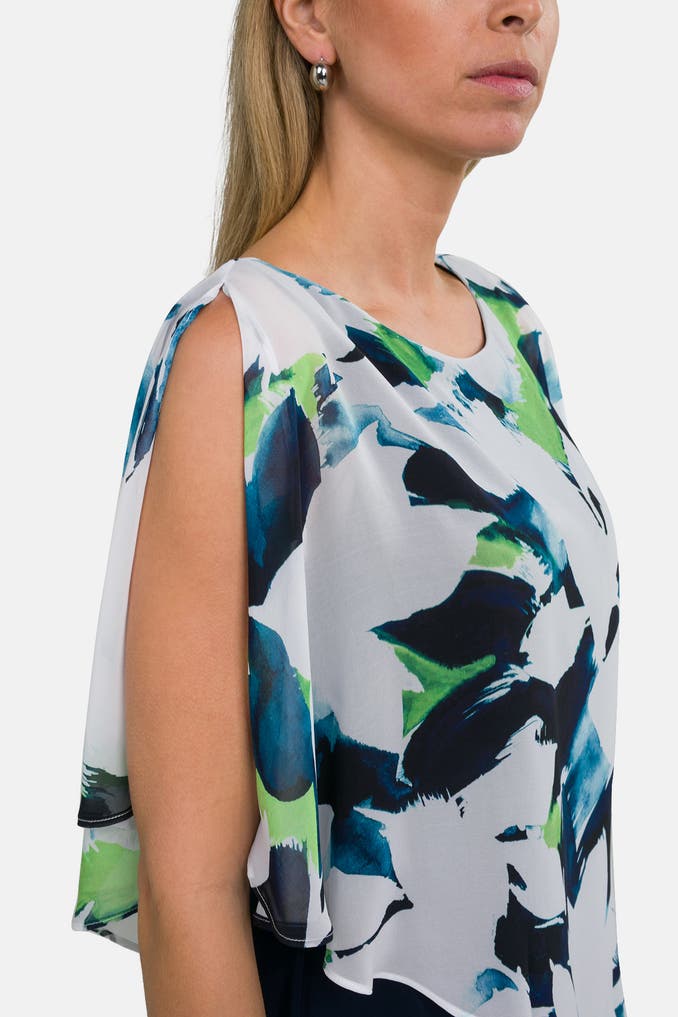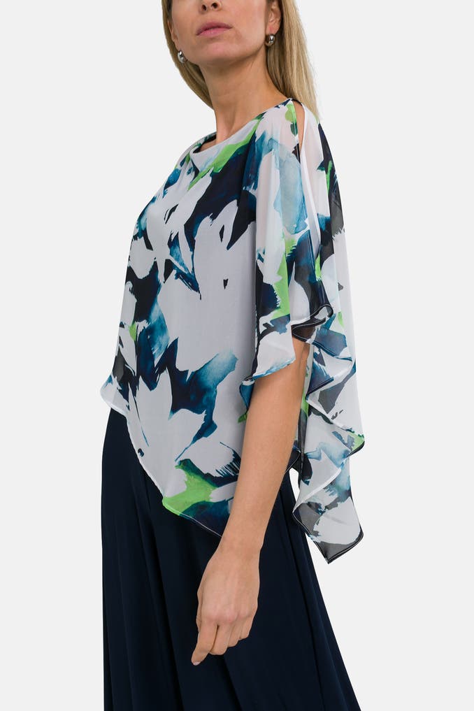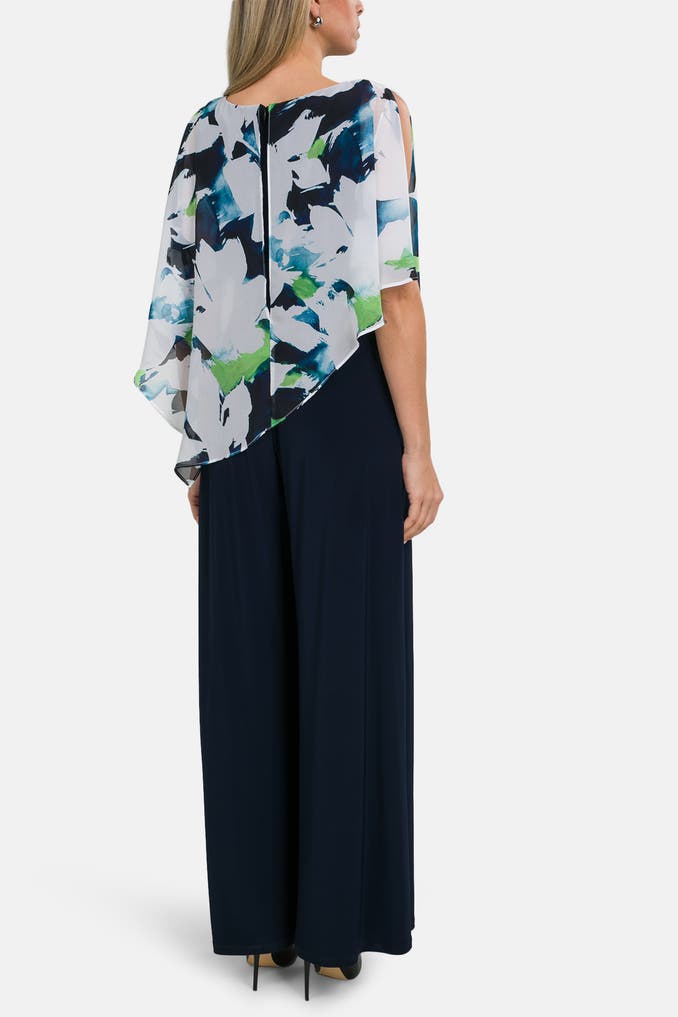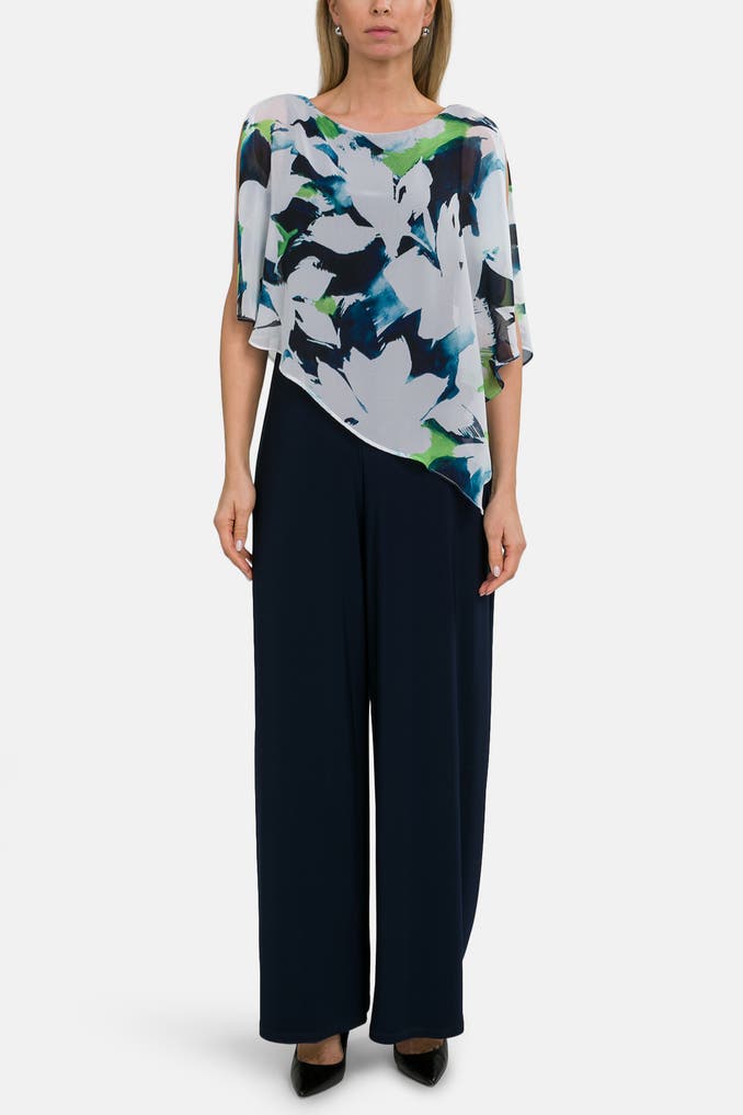 Sie suchen einen stylischen Jumpsuit für verschiedene Anlässe? Entdecken Sie den Jumpsuit von Joseph Ribkoff mit gemustertem Oberteil und Navy-Unterteil, kurzem Arm und Loose-Fit-Passform. Ideal für Freizeit- und Party-Looks