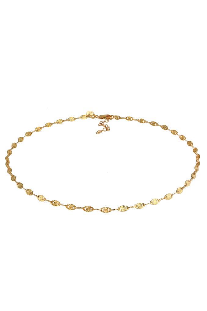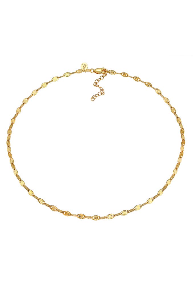 Diese einzigartige Choker Halskette, funkelt begeistert durch ihr aufregendes Vintage Design. Die filigranen aneinander gereihten ovalen Plättchen Glieder, glänzen je nach Lichteinfall so traumhaft wie ein Stern am Himmel. Dieses perfekte Schmuckstück ist ein zeitloser Blickfang am Dekolleté der Frau.