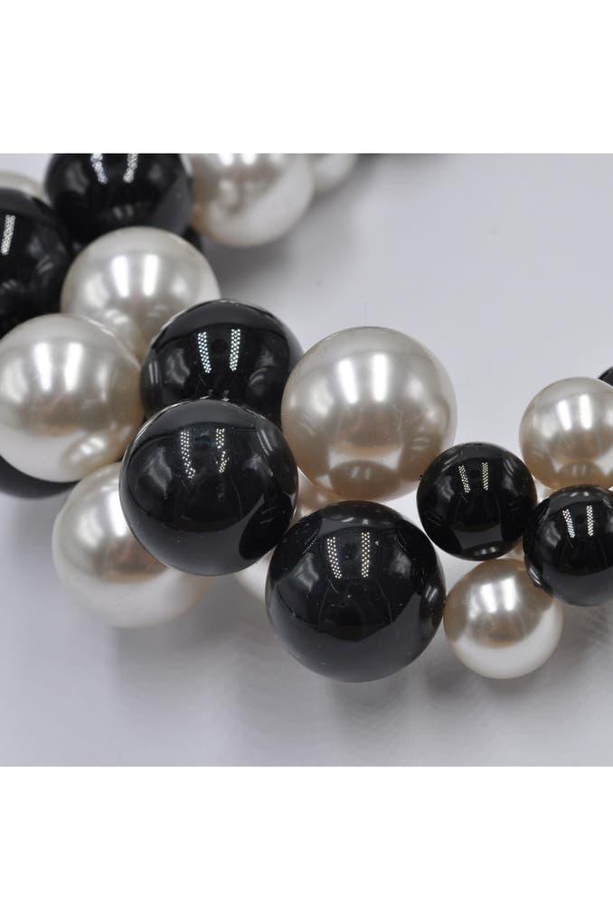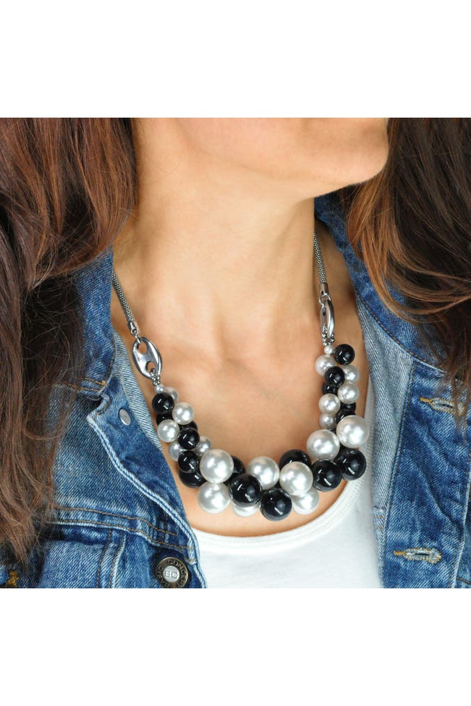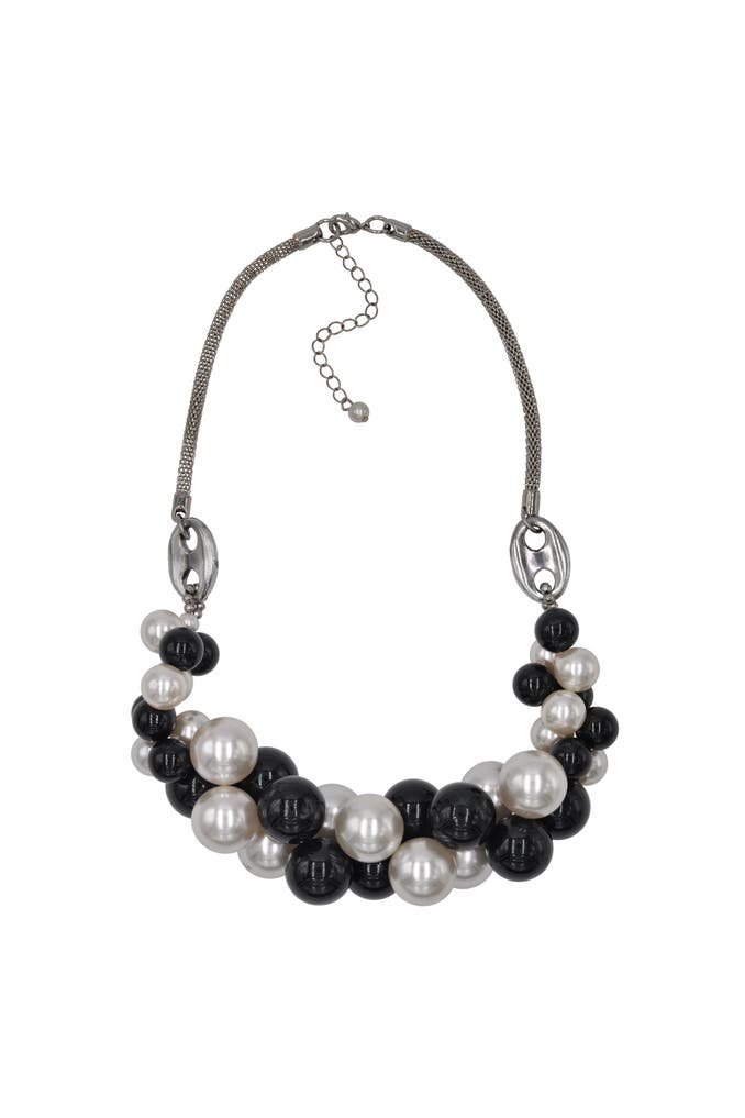 Üppiges Collier mit Perlenzierde schwarz und weis an Meshkette rhodiumfarben