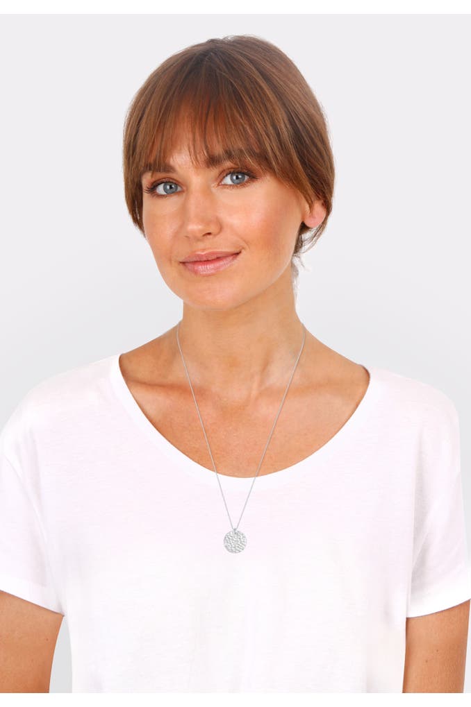 Eine schlichte und doch so schöne Halskette für Frauen. Der kreisrunde Anhänger des Schmuckstücks ist kunstvoll gehämmert. Ein stilvolles Accessoire im Coin Style verleiht jedem Look das gewisse Etwas. In Kombination mit einer kurzen Kette ist dieser lange Halsschmuck der perfekte Mix.