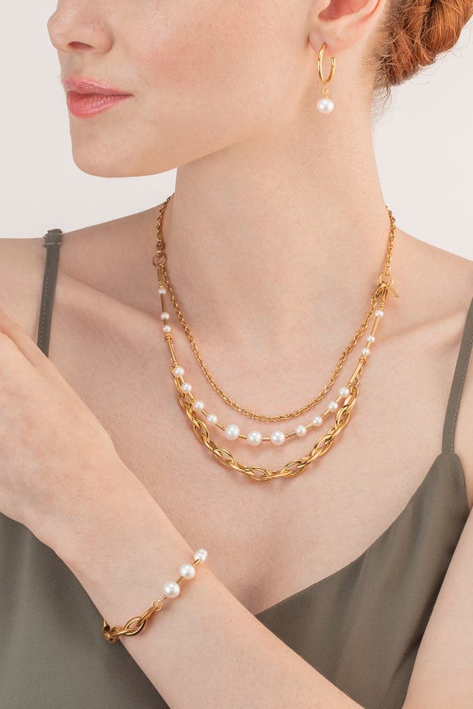 zarten Creolen, Anmut und Eleganz. Besonders ist nicht nur das Spiel aus verschiedengroßen Ketten und Perlen, sondern auch die innovative Multiwear-Option, die mehrere Layering und Längenvarianten je nach Outfit ermöglicht.