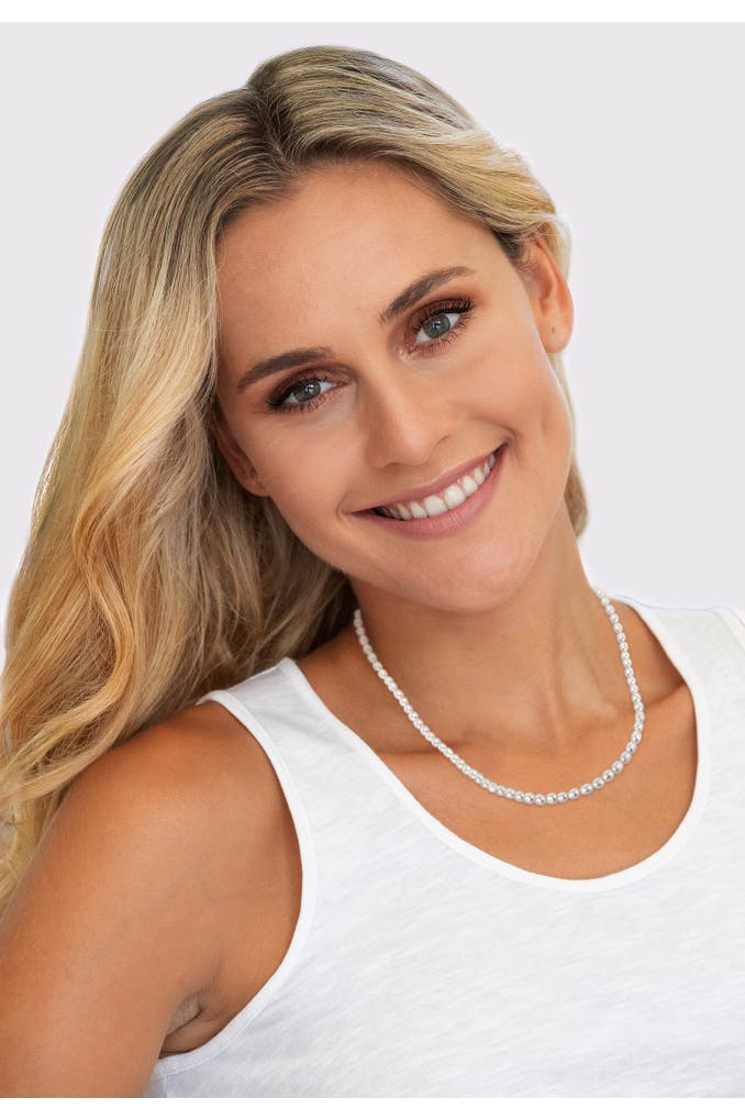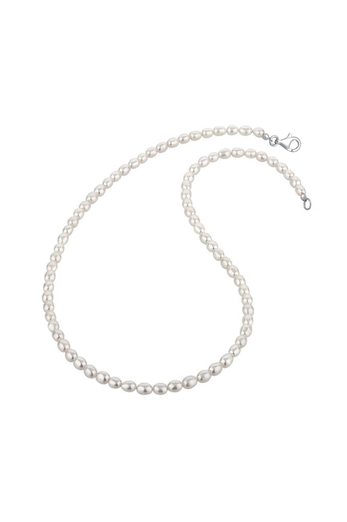 Klassisch zeitlose Perlenkette aus echten Süßwasserzuchtperlen in Weiß und einer Karabiner-Schließe aus 925 Sterling Silber. Die außergewöhnliche Süßwasser-Zuchtperlenkette in der selten ovalen Perlenform gehört zu der Grundausstattung jeder Schmuckschatulle. Eine durchgehende Perlenkette ist auch als Schmuckstück zu einem sportlichen Outfit gut geeignet.