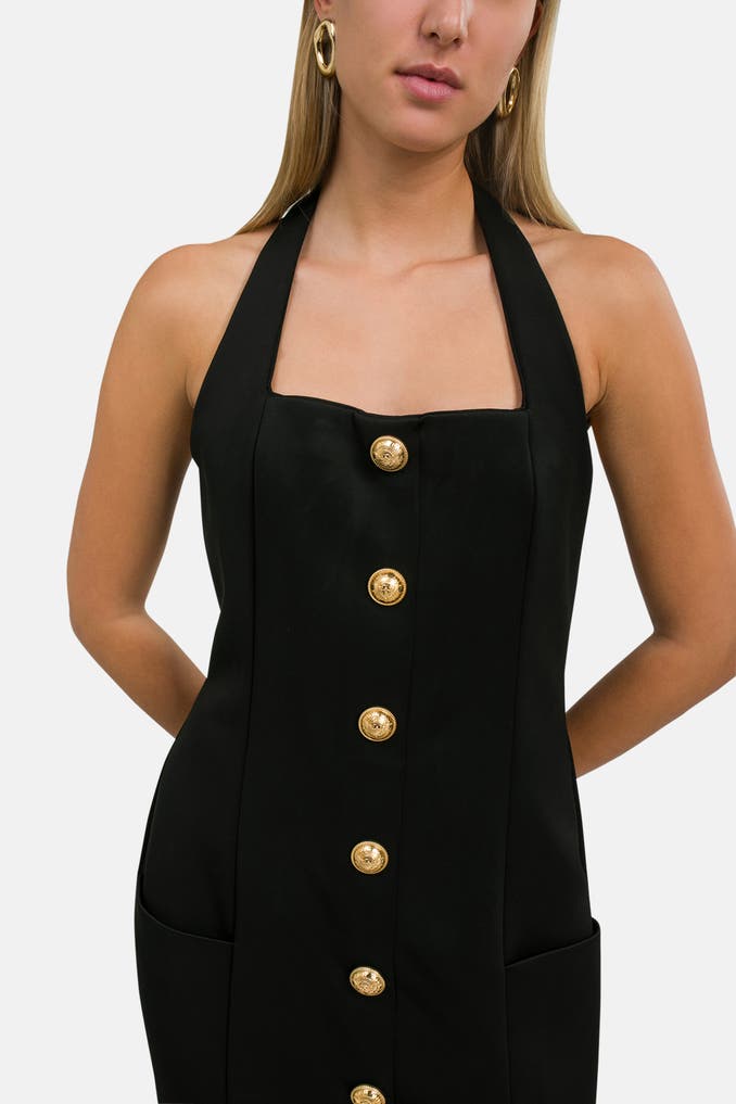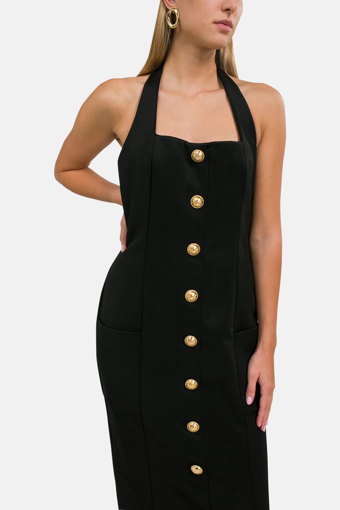 Sie suchen das perfekte schwarze Kleid für festliche Anlässe? Dann ist das ärmellose Kleid von Balmain genau das Richtige für Sie! Mit seinem eleganten, geraden Schnitt und dem Neckholder-Ausschnitt setzt dieses Midi-Kleid Ihre Figur gekonnt in Szene.