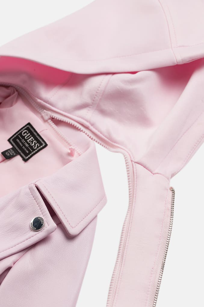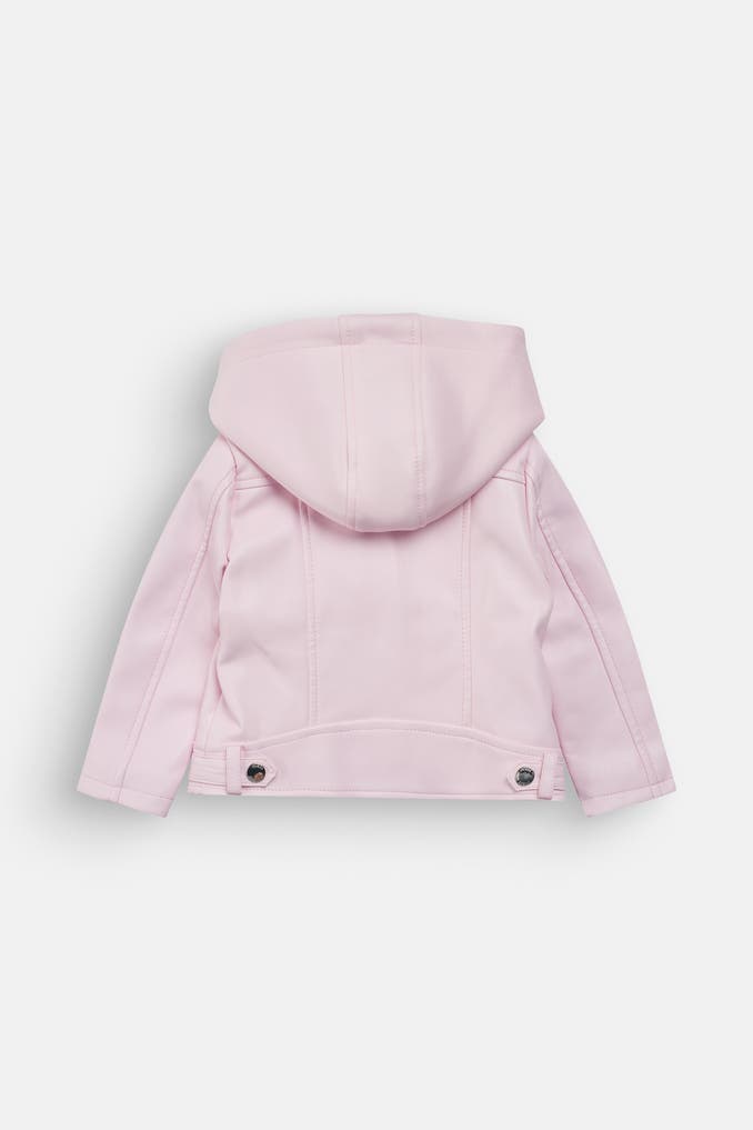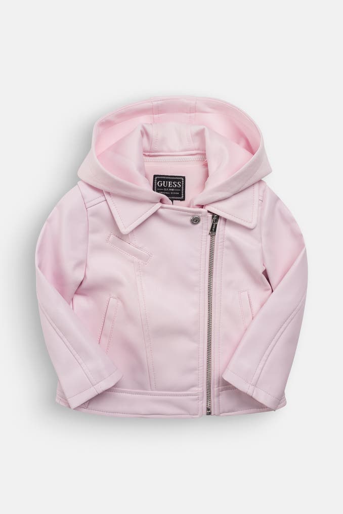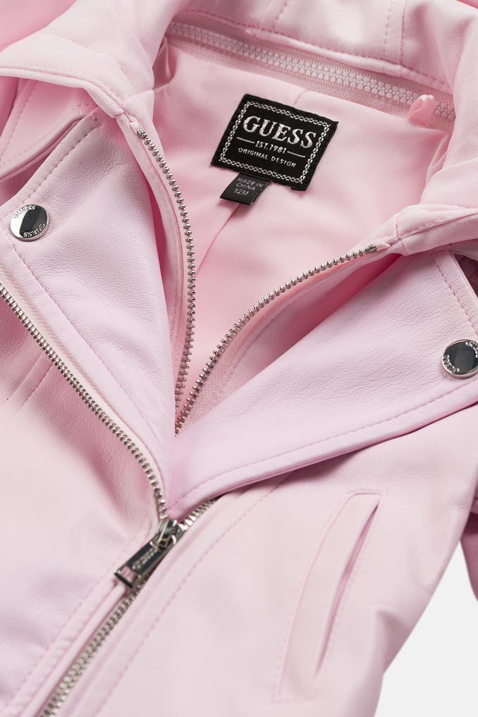 Mit dieser bezaubernden Kunstlederjacke in Hellrosa von GUESS fühlen sich kleine Mädchen pudelwohl und hübsch gekleidet. Das softe Kunstleder sorgt für einen angenehmen Tragekomfort und die praktische, abnehmbare Kapuze schützt an kühleren Tagen den Kopf. Perfekt für die Übergangszeit!