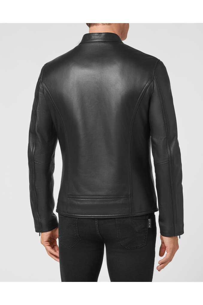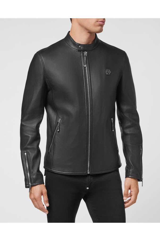 Bikerjacke aus weichem Nappa. Kragen mit Druckknopfleiste. Auf der linken Brust ist ein Aufnäher aus Saffianleder mit dem PP Hexagon aufgenäht. Reißverschluss und Manschetten mit Reißverschluss. Zwei Eingrifftaschen mit verdecktem Knopfverschluss. Futter aus Matelassé-Stoff.