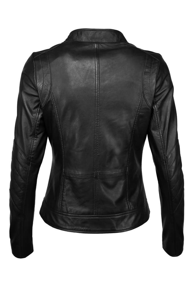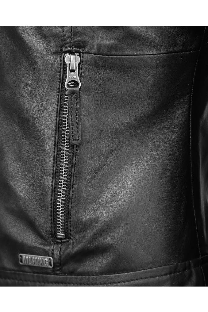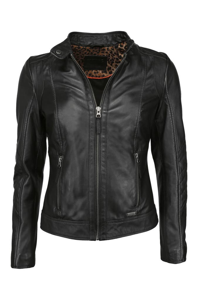 Trendige Damenlederjacke aus sanftem Lammleder der Marke MUSTANG. Die aufwendig eingenähten Seitentaschen mit Zipper und der kurze Stehkragen mit Druckknopf machen diese Jacke zu einem besonderen Highlight. Die Jacke besitzt sehr schöne Ziernähte und ist mit einer offenen Innentasche ausgestattet. Das gewisse Etwas erhält sie durch den Leopardenprint im Inneren.