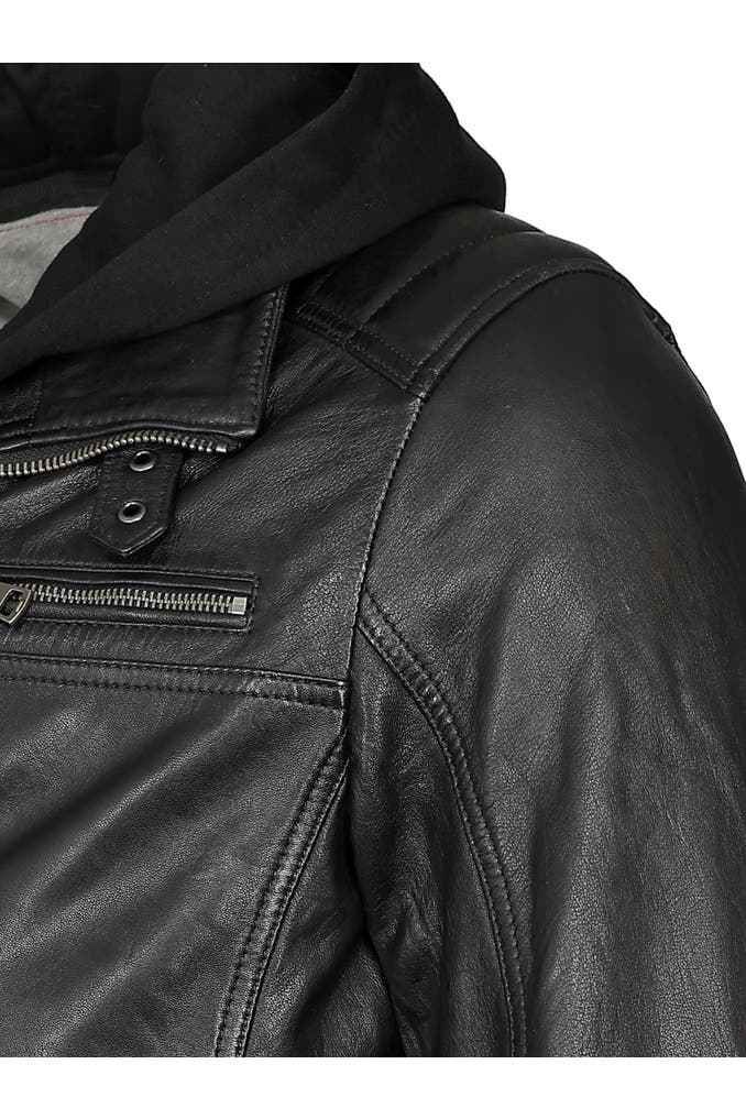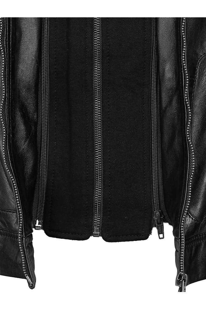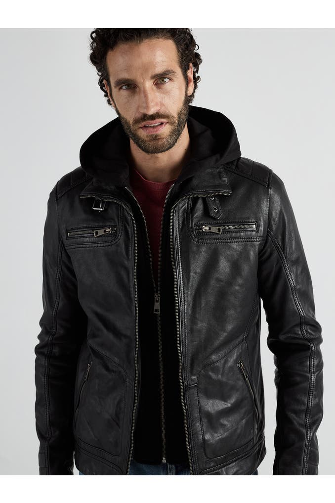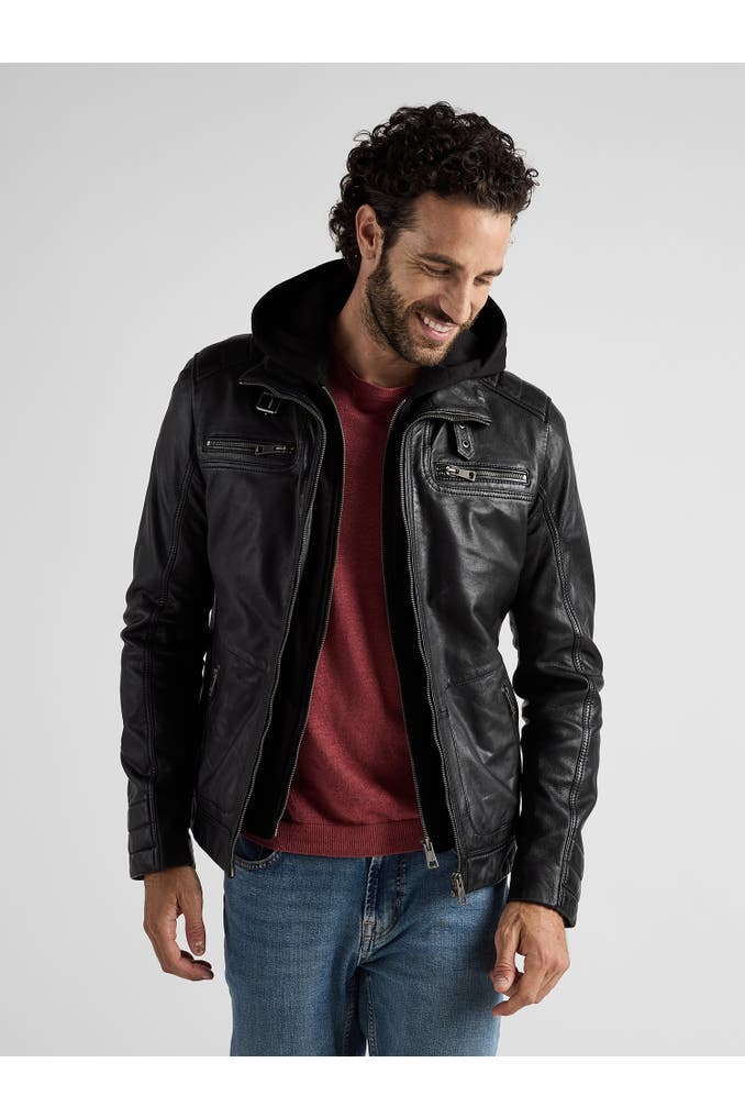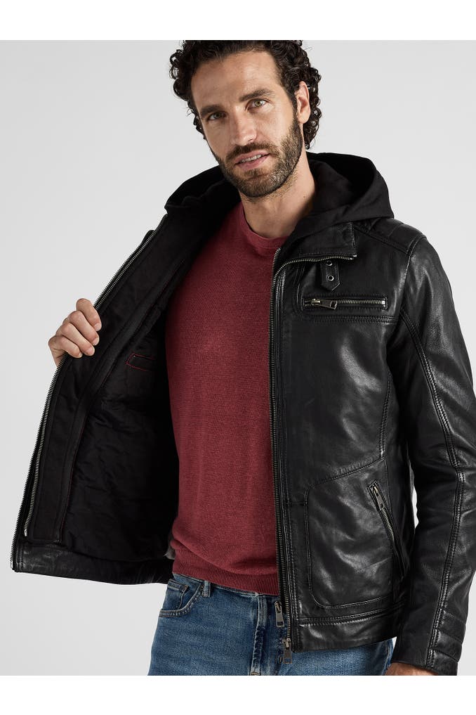 Die Jacke verfügt über eine abnehmbare Kapuze, die über den Reißverschluss inklusive des gesamten Einsatzes herausgenommen werden kann. Sie besitzt zudem zwei eingearbeitete Seitentaschen sowie zwei Taschen mit Zipper in der Höhe des Schlüsselbeins. Optische Highlights wie die feinen Absteppungen an den Schulterpartien sowie feine Ziernähte geben dieser Jacke Ihren außergewöhnlichen Charakter. Weiches Leder mit leicht tailliertem Schnitt sorgt für eine optimale Passform und ein angenehmes Tragegefühl.