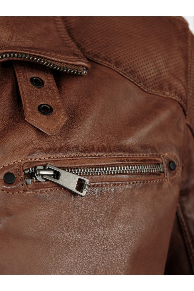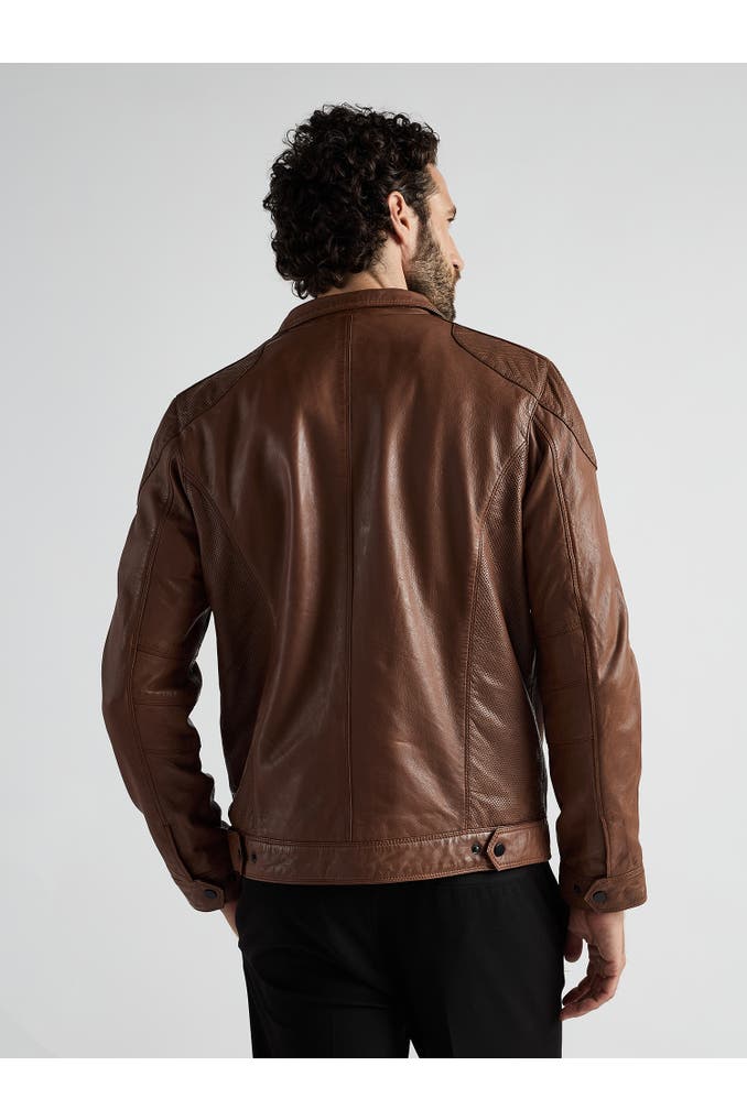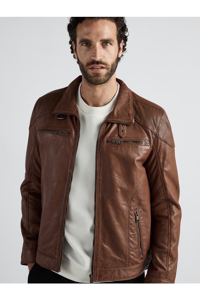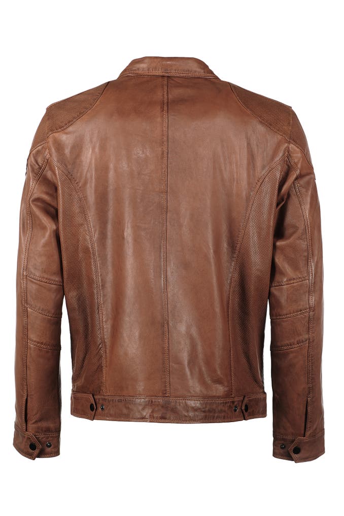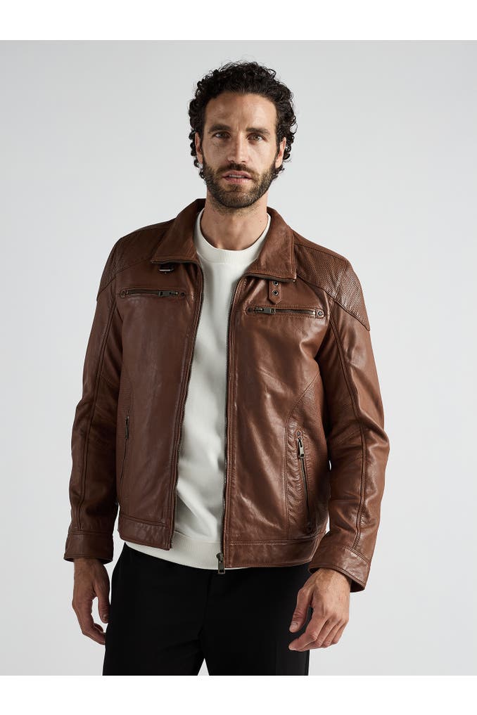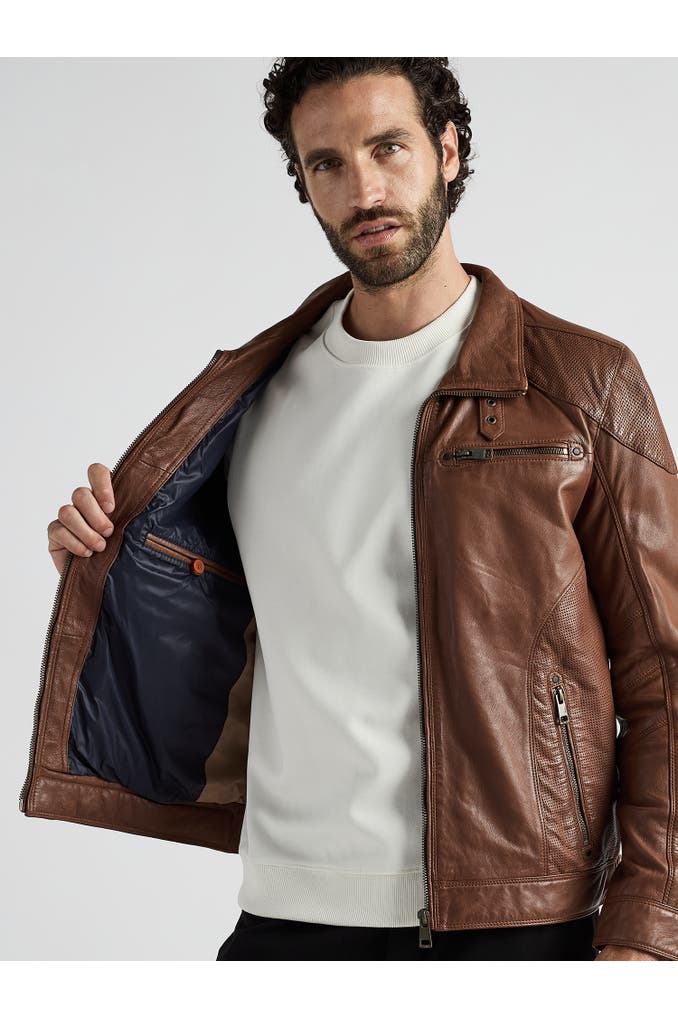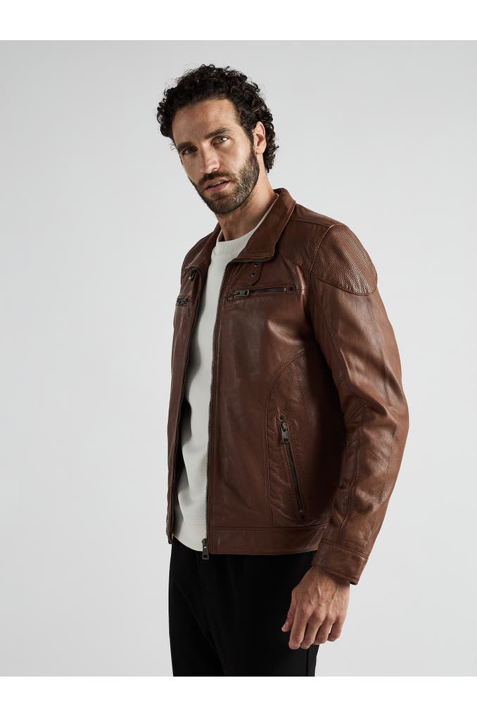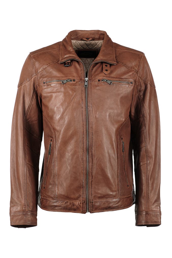 Diese Lederjacke aus weichem Lammleder besitzt zwei Brusttaschen mit Reißverschluss, zwei seitliche Einschubtaschen mit Druckknopfverschluss und zwei Innentaschen. Die Verschlussschnalle am Hemdkragen bildet im Zusammenhang mit den sauber eingearbeiteten Ziernähten & dem Polyesternetz im Inneren eine fein abgestimmte Lederjacke für Herren. Sie wird über einen Reißverschluss geschlossen und ist gerade geschnitten. Für den optimalen Sitz befinden sich jeweils zwei Druckknöpfe an den Ärmelenden, die sich individuell verschließen lassen.