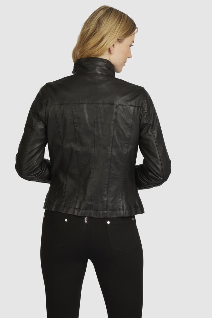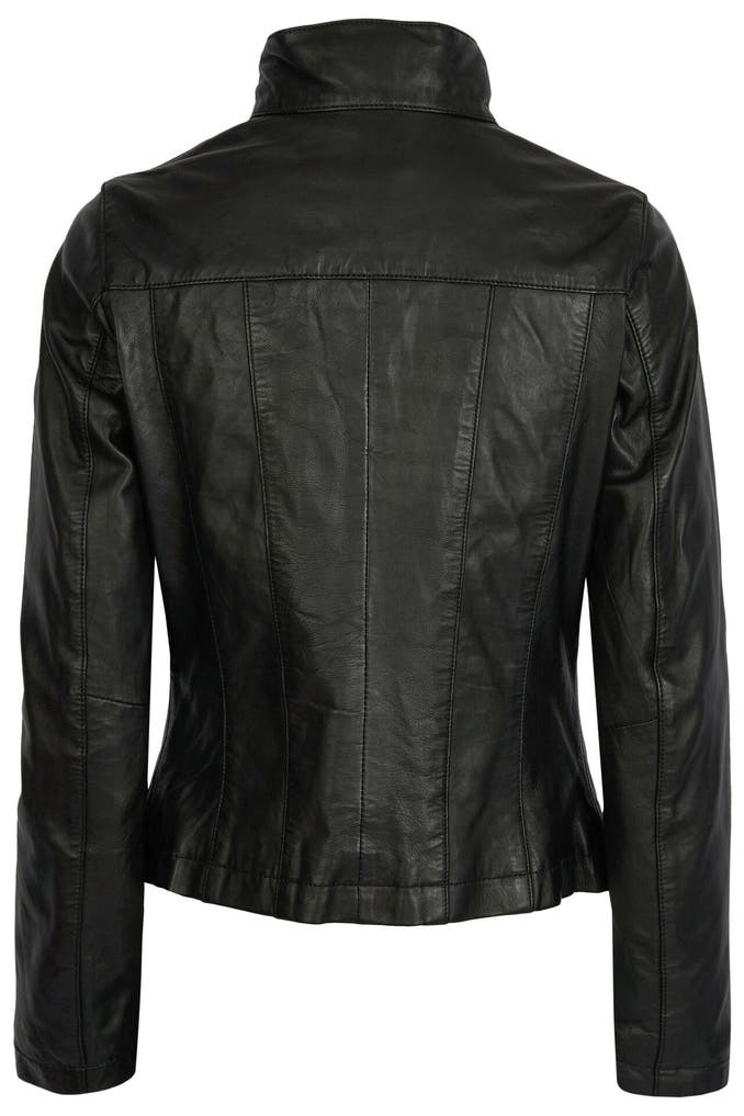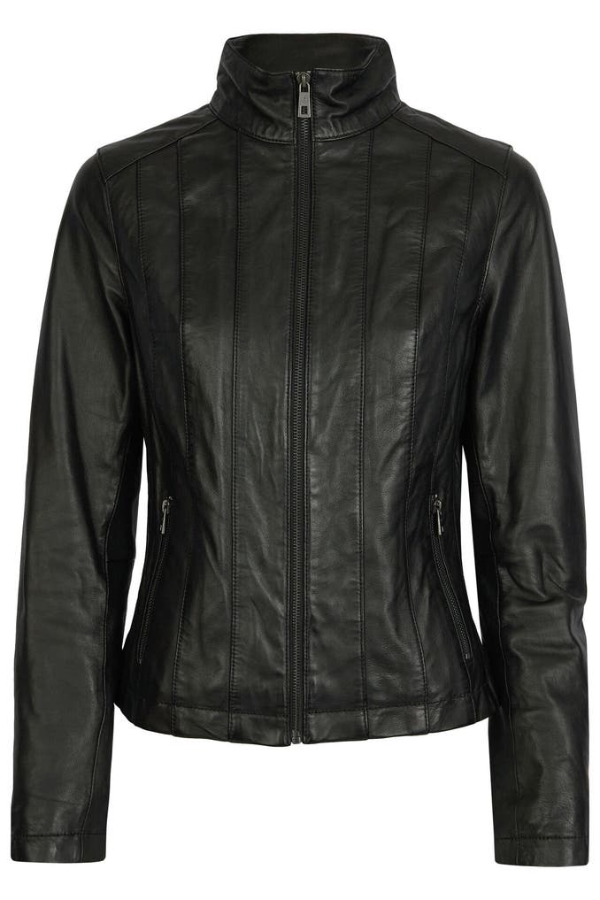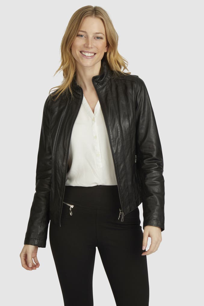 Diese klassische gesteppte Lederjacke besticht durch ihren Stehkragen, Reißverschlusstaschen und hochwertiges, reines Leder. Ein zeitloser Look mit modernen Details für einen stilvollen Auftritt.