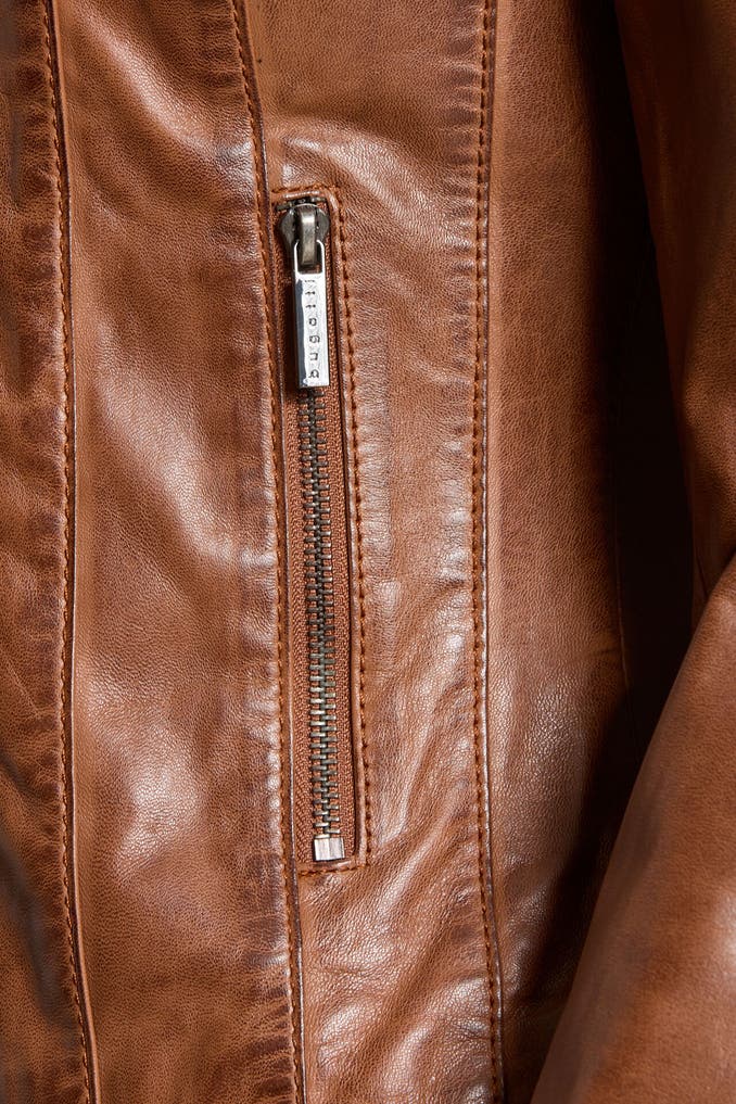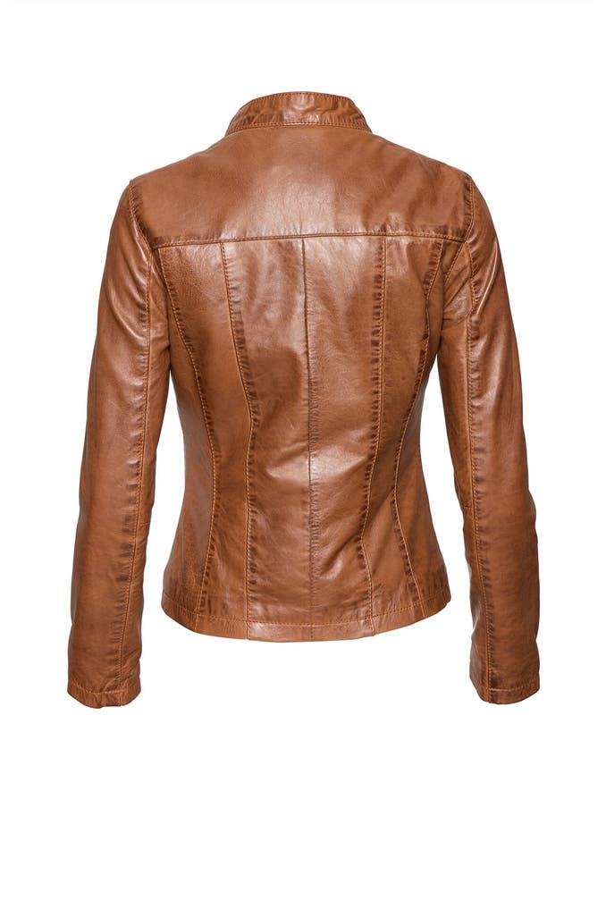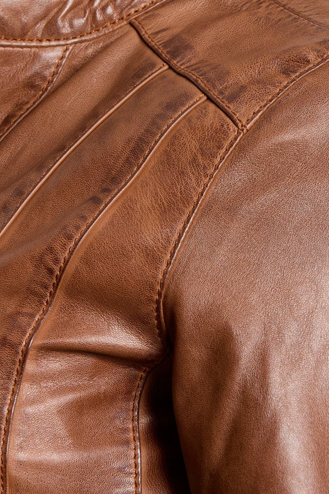 Diese klassische gesteppte Lederjacke besticht durch ihren Stehkragen, Reißverschlusstaschen und hochwertiges, reines Leder. Ein zeitloser Look mit modernen Details für einen stilvollen Auftritt.