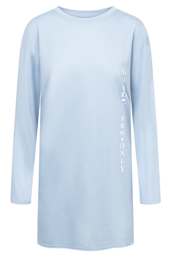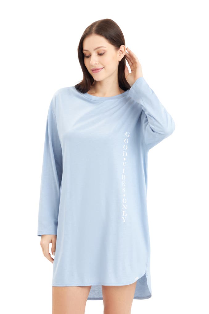 Nachthemd ist hinten etwas länger als am Vorderteil, Rundhals mit Blende und seitlich mit Aufschrift bedruckt.