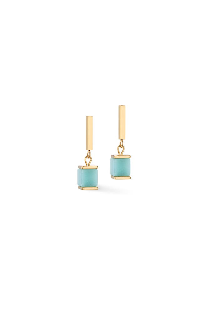 Für Echtstein Liebhaberinnen. Mit diese Würfel-Ohrringen in 6 mm, setzen Sie ein Statement. Hier mit leuchtendem Amazonit und glänzendem Edelstahl Gold. Ohrringe passen auch zu der Halskette Precious Classic Cubes Multicolor-Gentle.