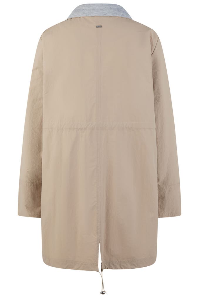 Parkajacke aus körniger, sportlicher Ware mit Reißverschluss an der vorderen Kante, Leistentaschen mit Metallperlen-Zierband, Tunnelzug in Stehkragen, Taille und Saum, Rückenteilungsnaht, Jersey-Belege an Kante und Hals, Polyesterfutter im Ärmel.