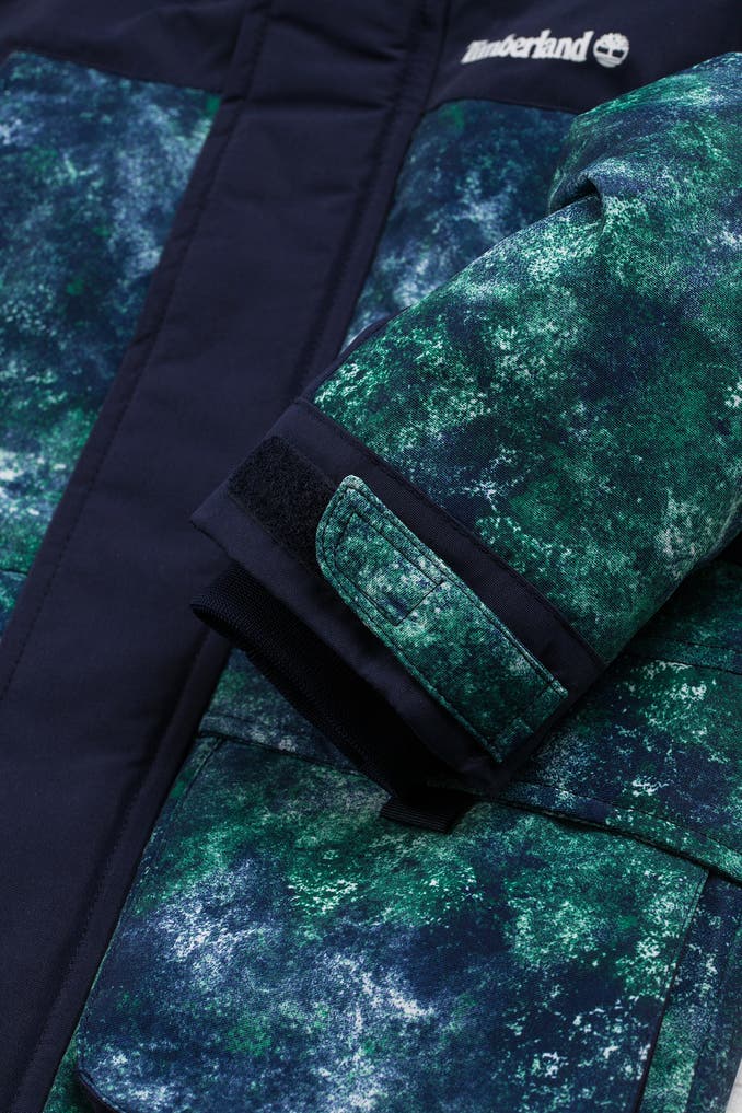 Mit dem gemusterten Parka von Timberland in verschiedenen Farbtönen ist Ihr kleiner Junge optimal für Freizeitaktivitäten ausgestattet. Der Parka verfügt über eine Kapuze und ist wasserabweisend, was ihn perfekt für wechselhaftes Wetter macht.