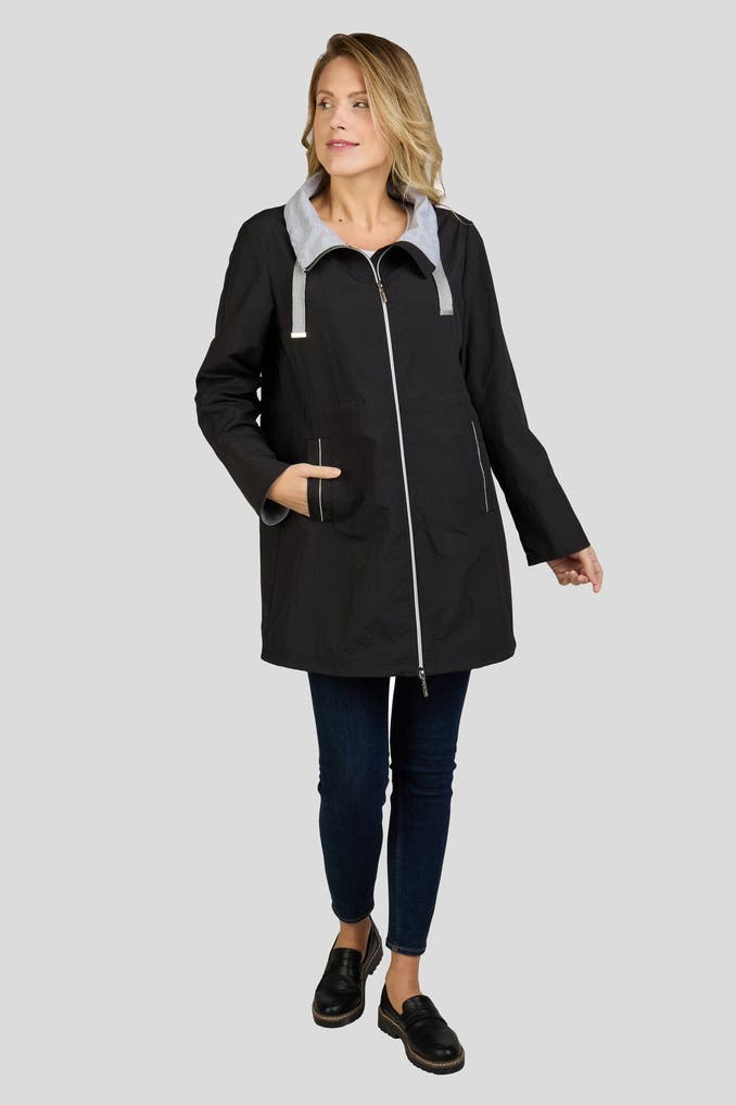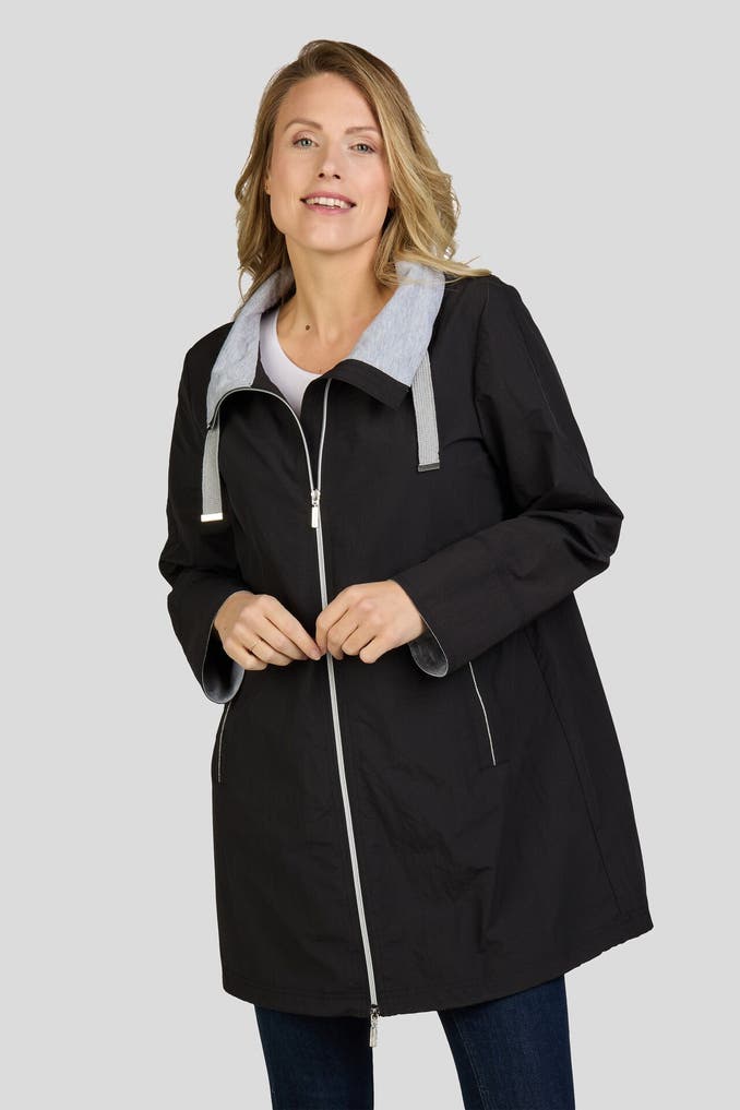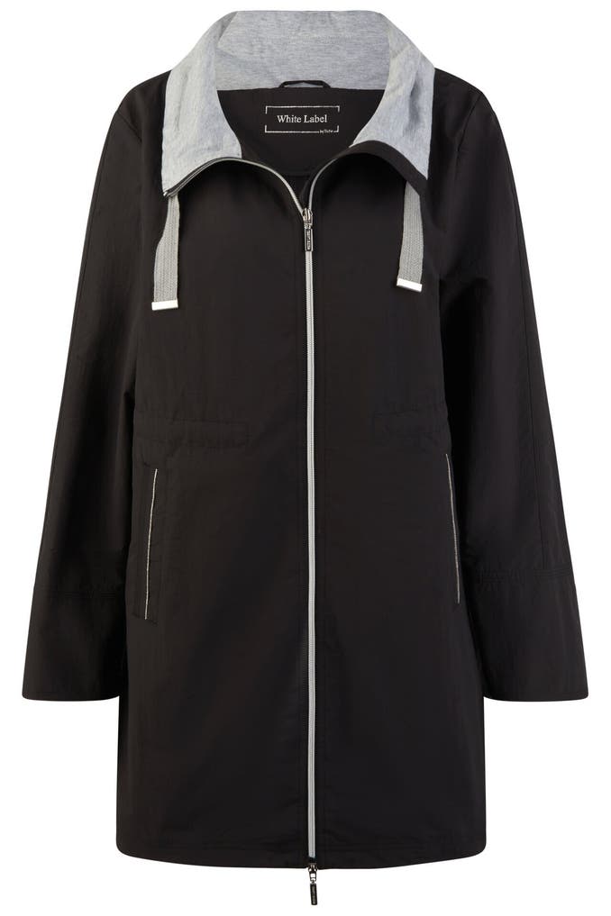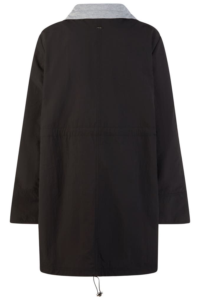 Parkajacke aus körniger, sportlicher Ware mit Reißverschluss an der vorderen Kante, Leistentaschen mit Metallperlen-Zierband, Tunnelzug in Stehkragen, Taille und Saum, Rückenteilungsnaht, Jersey-Belege an Kante und Hals, Polyesterfutter im Ärmel.
