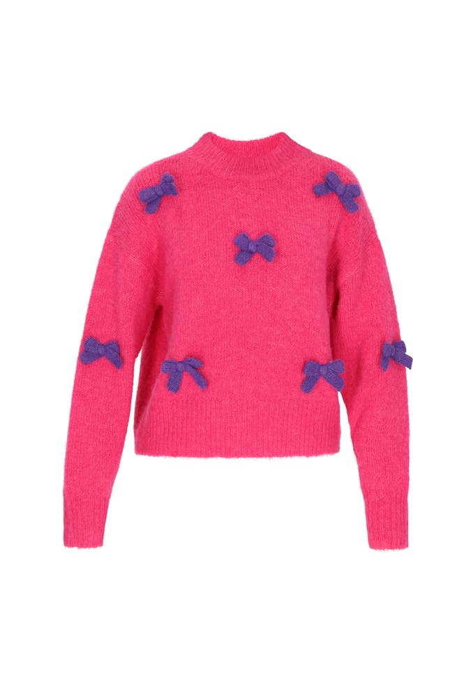 Refresh your Back to School wardrobe with this cozy sweater from the MyMo Collection. Featuring a relaxed fit, crew neck, and dropped shoulders, it offers comfortable everyday wear with a stylish edge. The soft knitted fabric is decorated with delicate bow embroidery, adding a playful and feminine touch. Perfect for casual days at school or relaxing weekends, this comfy item blends youthful fashion with effortless charm.