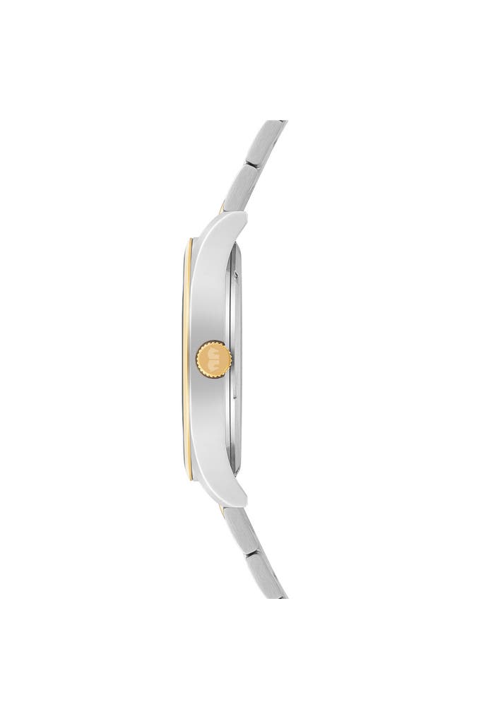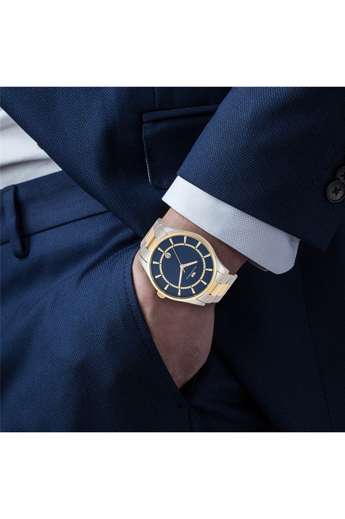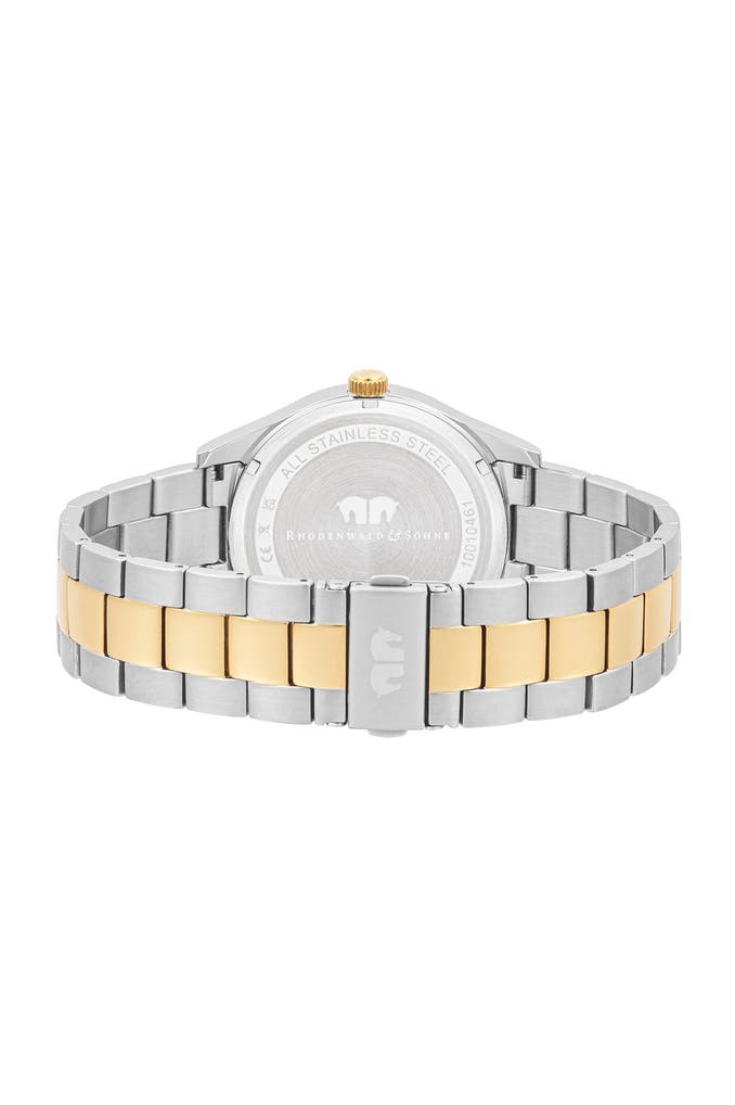 Diese Herrenuhr der Manufaktur Rhodenwald & Söhne vereint stilvolle Eleganz mit den Werten traditioneller Horlogerie. Das dunkle Zifferblatt wird durch markante Strichindizes strukturiert und mit lumineszierenden Obélisque-Zeigern und einer Datumsanzeige kombiniert. Highlight des Designkonzepts ist der Bicolor-Look Silber/Gelbgold mit polierten und satinierten Edelstahl-Elementen, sowohl im Gehäuse als auch im maskulinen Gliederarmband mit Sicherheitsfaltschließe. Das robuste Material und ein langlebiges Quarzuhrwerk machen den Zeitmesser zum verlässlichen Begleiter im Büro und in der Freizeit.