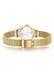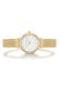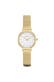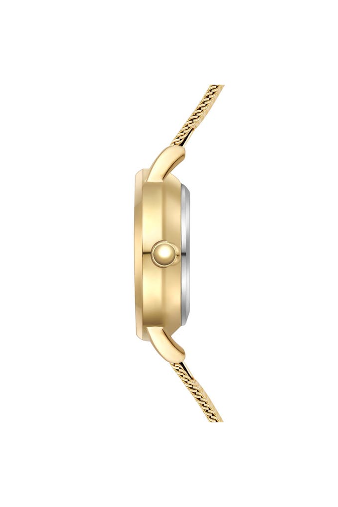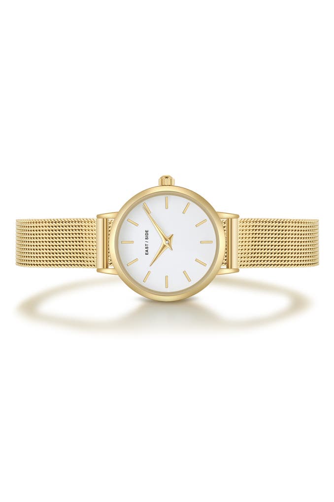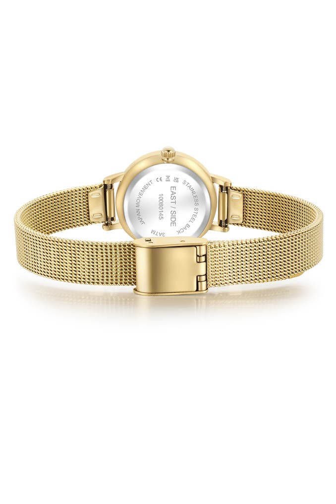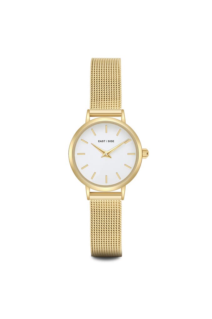 Sie tragen gerne Horlogerie-Highlights in der Tradition alter Uhrmacherkunst? Diese Damenuhr des jungen Labels EASTSIDE bereichert jede Uhrensammlung und zaubert exklusiven Flair ans Handgelenk: Ein minimalistisches, rundes Gehäuse mit schlanker Lünette umrahmt ein aufgeräumtes Zifferblatt, das sich bewusst auf dezente Strichindizes und edle Dauphinzeiger reduziert. Raffinierter Eyecatcher ist das Edelstahl-Milanaise-Armband mit seiner filigranen Mesh-Optik. Gehäuse und Armband sind ionenplattiert und glänzen Ton-in-Ton in warmem Gelbgold. Ein präzises Quarzuhrwerk macht die Uhr zum verlässlichen Zeitmesser.