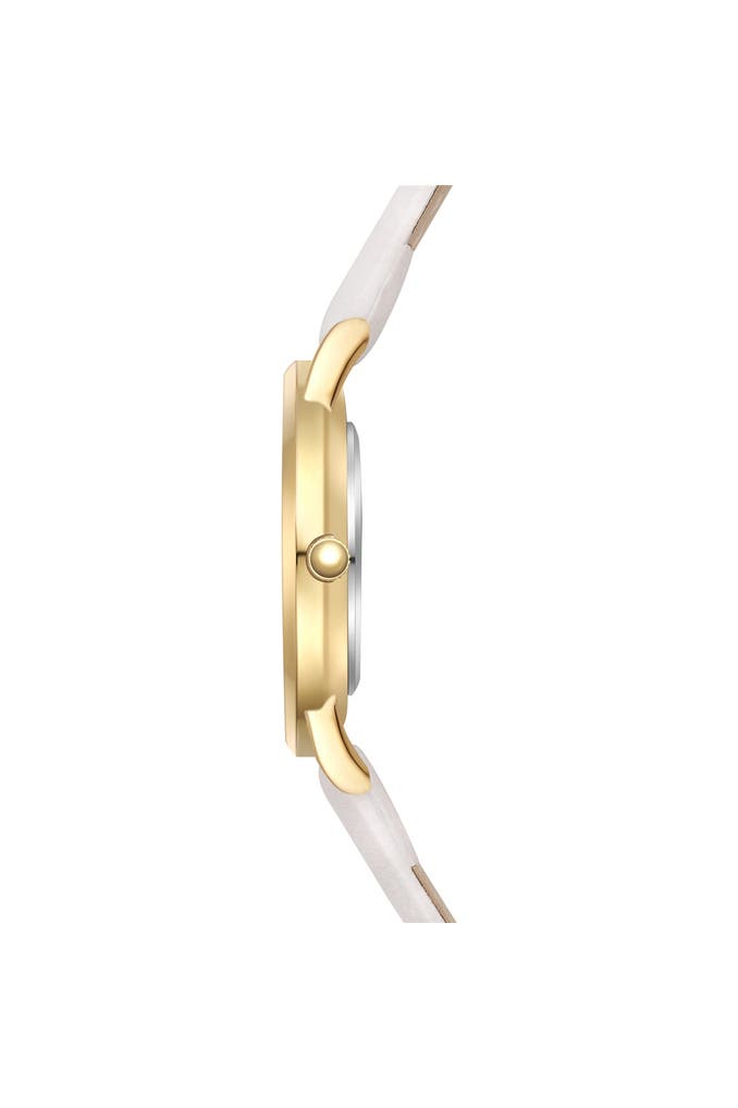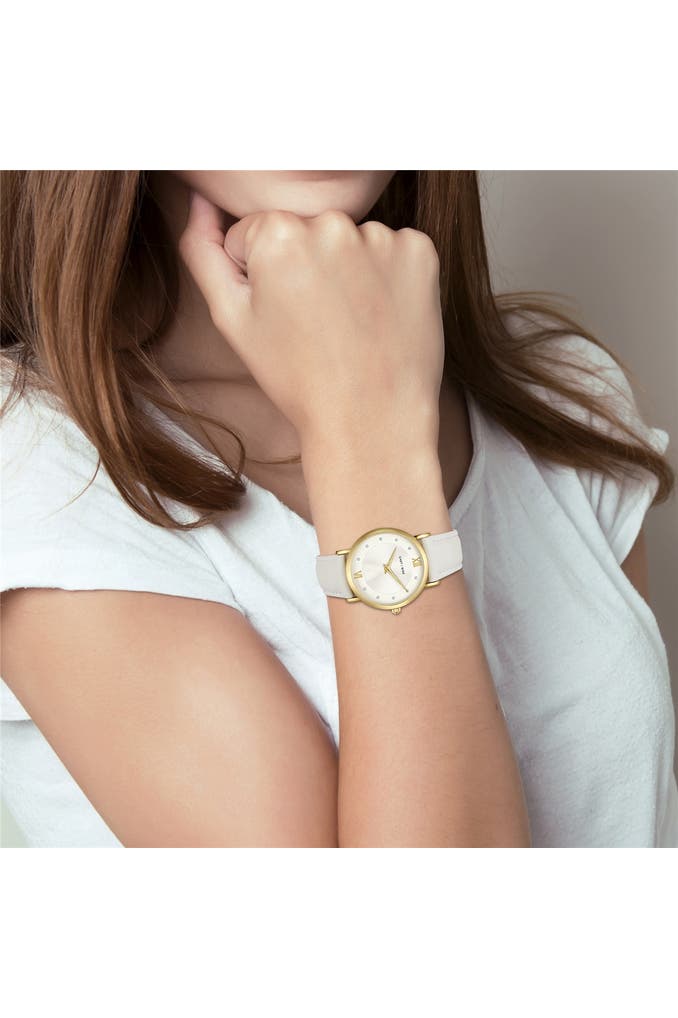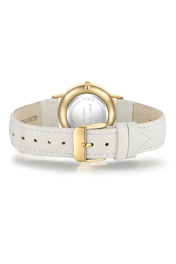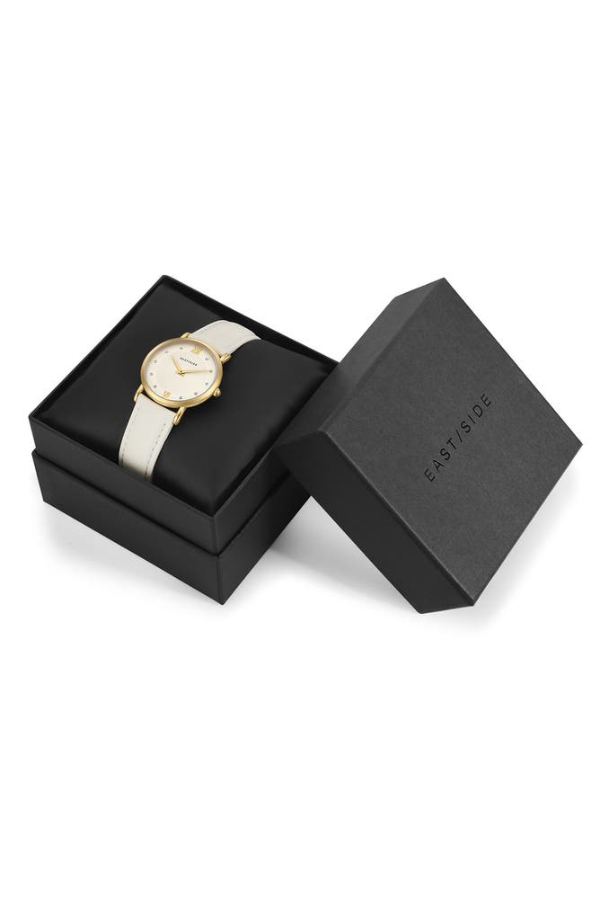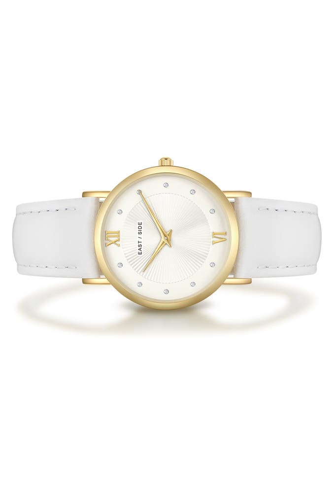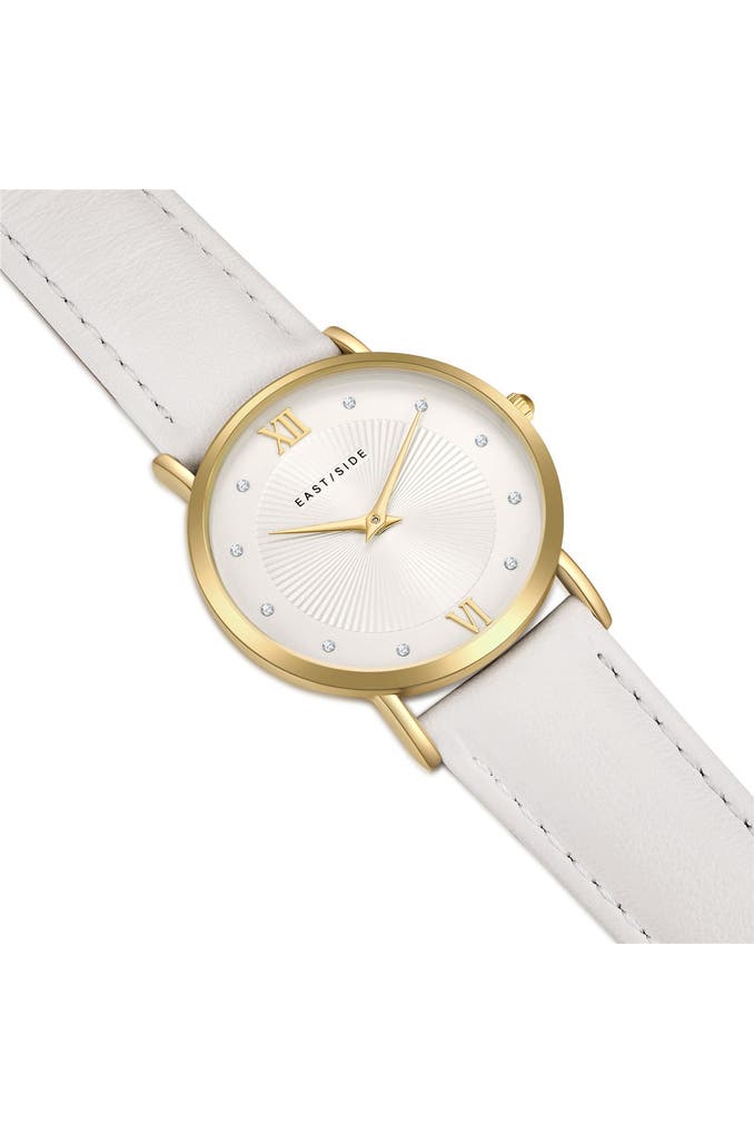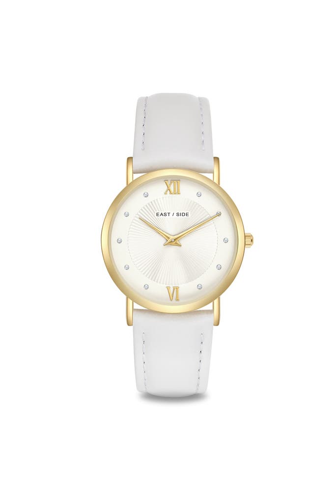 Sie sind auf der Suche nach einer Damenuhr, die traditionelle Horlogerie-Werte mit modernem Luxus-Flair vereint? Dann ist dieses Modell des jungen Labels EASTSIDE die perfekte Ergänzung für Ihre Uhrensammlung. Das runde Gehäuse mit Plattierung in Gelbgold umrahmt ein Sunray-Zifferblatt, das raffiniert mit Lichtreflexen spielt, ansonsten aber auf Purismus setzt. Schlichte Zifferblattmarkierungen und edle Dauphinzeiger zahlen perfekt auf diesen Look ein. Ein weiches Echtlederarmband schmiegt sich angenehm ans Handgelenk und das Innenleben punktet mit einem verlässlichen Quarzuhrwerk. Ein außergewöhnlicher Eyecatcher am Handgelenk!