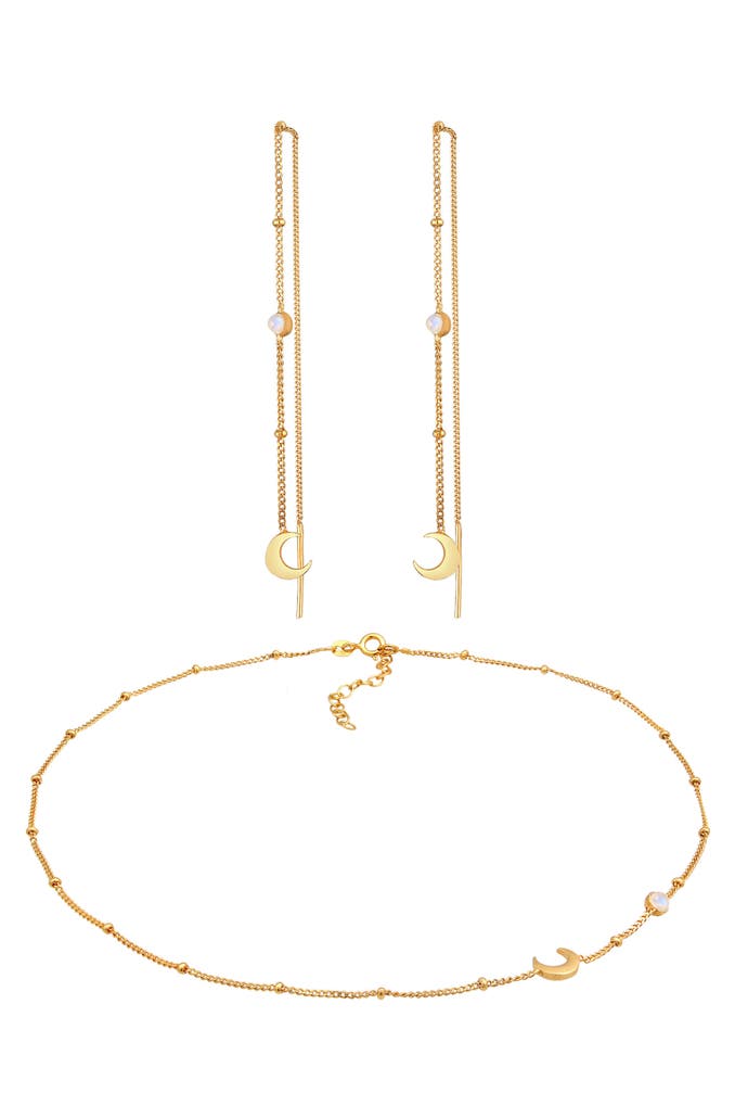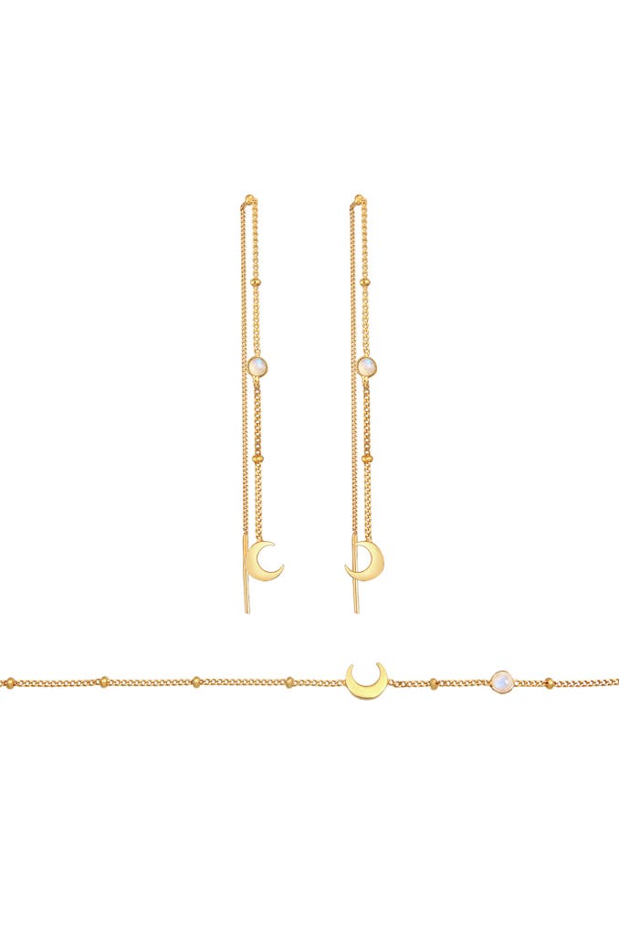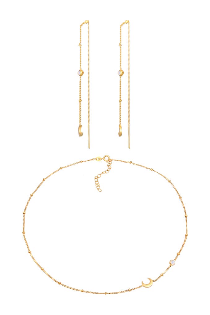 Dieses wunderschöne 2-teilige Schmuck Set, steht für Hoffnung und Träume. Zurückhaltend, schlicht ziert ein Halbmond beide Schmuckstücke. Zudem ist in die Kugelkette und Durchzieher Ohrringe ein fein schimmernder Mondstein eingearbeitet. Wie ein Nachthimmel, präsentieren sich der Mondstein Solitär in Kombination mit dem Halbmond Anhänger. Ob am Tag oder in der Nacht der romantische gestalteter Choker in Verbindung mit modisch, verspielten Ohrhänger passt perfekt zu deinem Look.