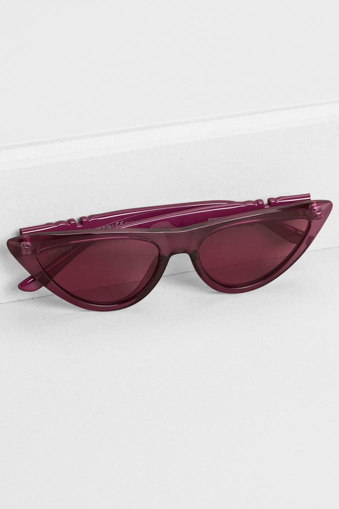 Verwöhnen Sie sich mit Eleganz und Style mit der Sonnenbrille 'Sparks' in Aubergine von JIMMY CHOO. Das Cateye-Design verleiht Ihnen eine feminine Note und setzt gekonnt Akzente in Ihrem Outfit. Sichern Sie sich dieses stylishe Accessoire für die sonnigen Tage!