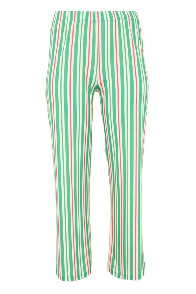 Lassen Sie Ihre Beine nicht nur laufen, sondern auch sprechen! Diese weite, bedruckte Hose ziert ein Streifendessin in leuchtendem Pink und Grün. Hergestellt aus dem Dolce-Material, mit einem elastischen Bund versehen und einfach mit einer Vielzahl von Farben zu kombinieren.