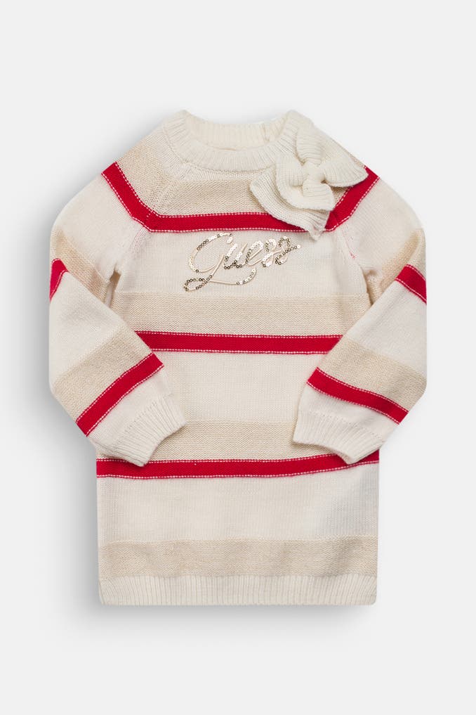 Verleihen Sie Ihrem Kind mit dem gestreiften Strickkleid von GUESS einen modischen und gleichzeitig bequemen Look. Das Kleid mit langen Ärmeln und Rundhalsausschnitt eignet sich perfekt für Freizeitaktivitäten und sieht durch die feine Strickqualität besonders hochwertig aus.