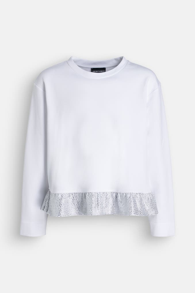 Setzen Sie ein modisches Statement mit dem weißen Sweatshirt 'Felpa' von EMPORIO ARMANI. Perfekt für stilbewusste Mädchen, die auf Qualität und Stil setzen.