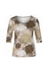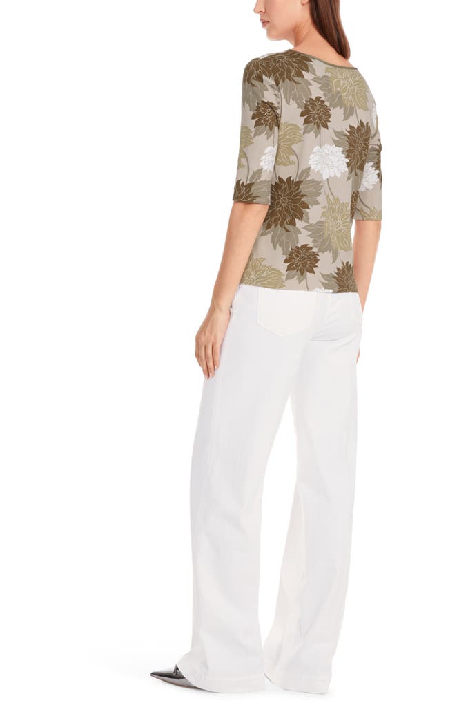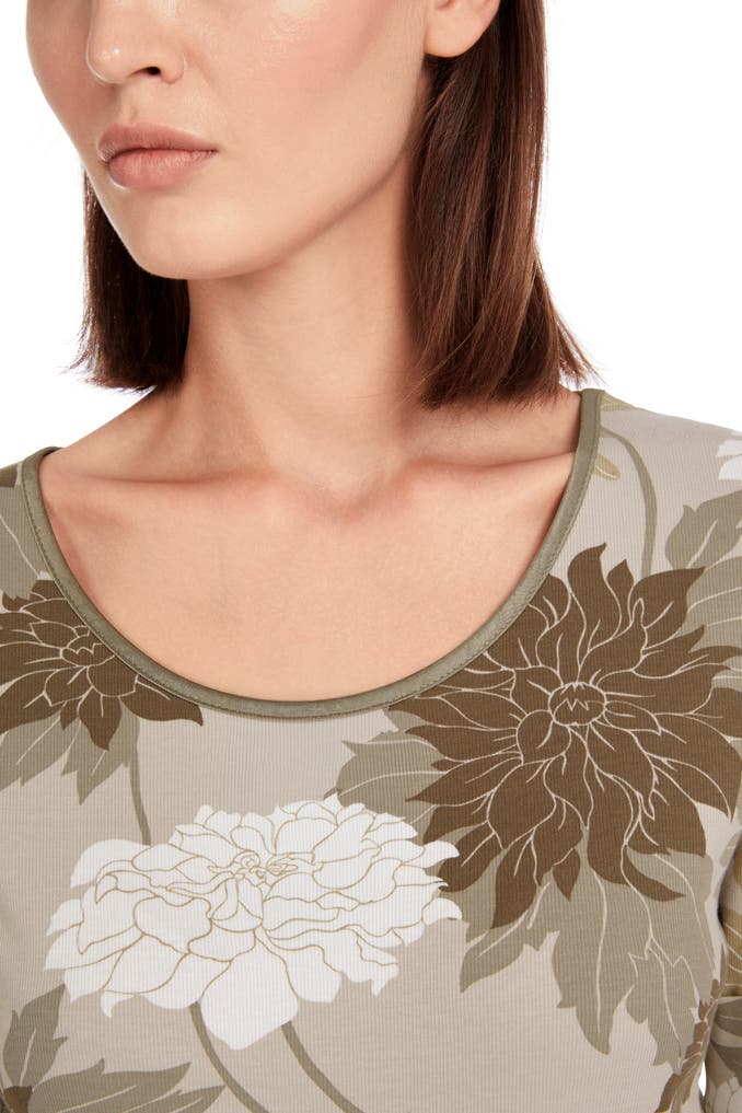 Dieses T-Shirt zeigt allover einen floralen Print. Es ist figurnah geschnitten und besitzt dreiviertellange Ärmel. Auch besticht das Oberteil mit seinem softem Baumwollstretch im feinen Rippstrick.