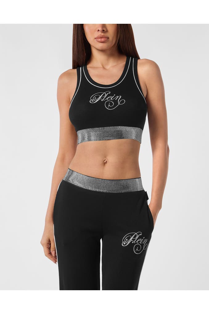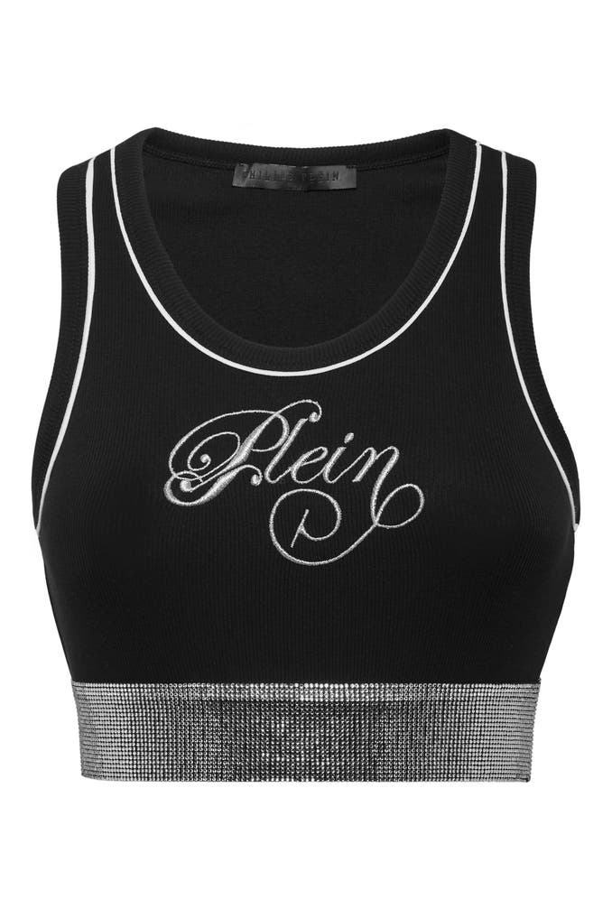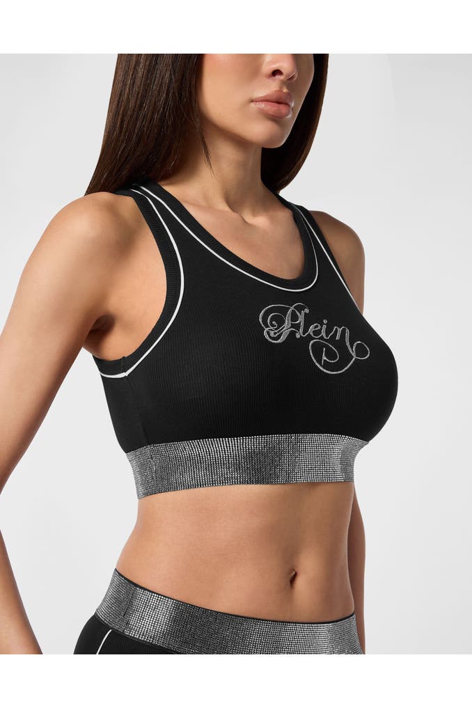 Werten Sie Ihre Eleganz auf und wählen Sie dieses Mini-Tank-Top aus Rippstrick-Jersey. Sehen Sie sich die Details an. Rippenstrick aus Stretch-Baumwolle und Modal intelock Strassapplikation auf dem Po Lurex-Stickerei auf der Vorderseite Passform: tailliert