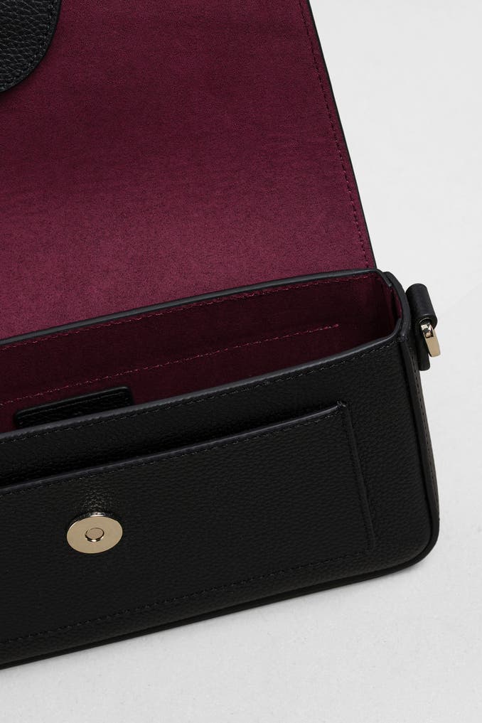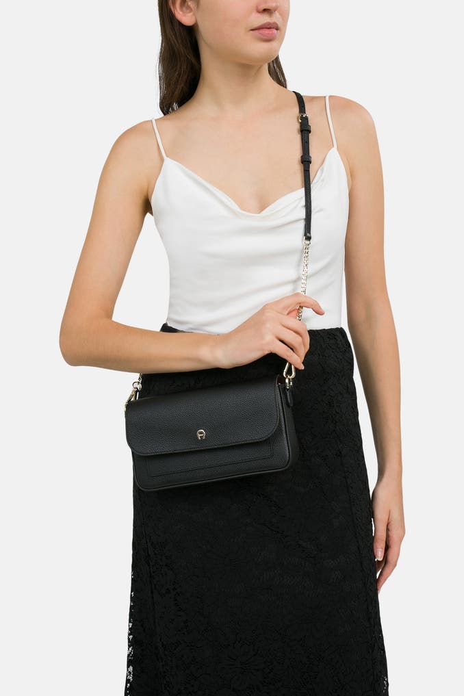 Verwöhnen Sie sich mit der eleganten Umhängetasche 'Atina' in Schwarz von Aigner. Das glatte Leder, die goldfarbene Details und der abnehmbare Schulterriemen machen diese Tasche zu einem zeitlosen Klassiker. Setzen Sie ein Statement mit diesem hochwertigen Modell und vervollständigen Sie Ihr Outfit mit einem Hauch von Luxus.
