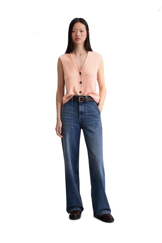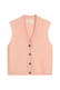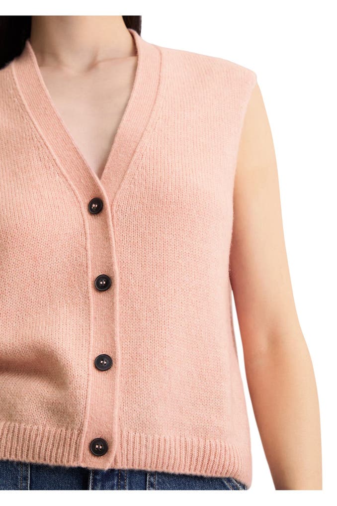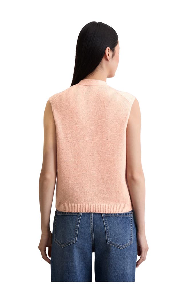 Die ärmellose Strickweste aus hochwertigem, supersoftem Schurwolle-Mix ist die perfekte Mischung aus Cardigan und Pullunder. Das normal lange Modell hat eine relaxte Passform, einen tiefen V-Ausschnitt und vier kontrastierende Knöpfe in Hornoptik. Sie hat eine glatt gestrickte Ausschnittblende und einen gerippten Saumabschluss. Besonders edel wirkt die „französische Schulter“: Hier liegt die Schulternaht nicht am höchsten Punkt, sondern ist lässig nach hinten versetzt. Trendstarker Styling-Tipp: über eine weiße Bluse kombinieren oder als Solo-Piece tragen.