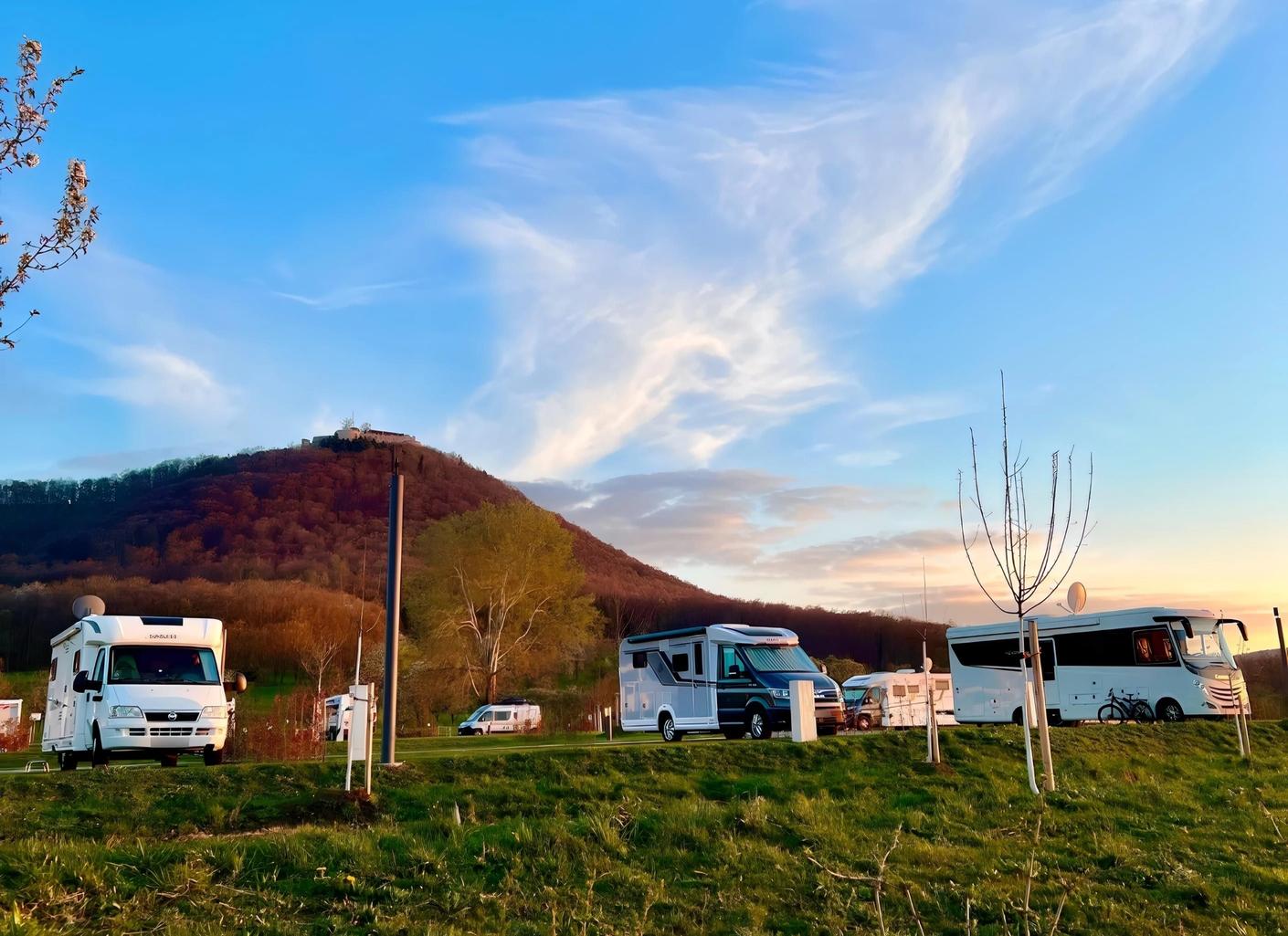 New camping site at Panorama Therme Beuren, in the middle of the orchard paradise with the best views of the region and Hohenneuffen Castle. The site has 58 pitches and is open all year round.